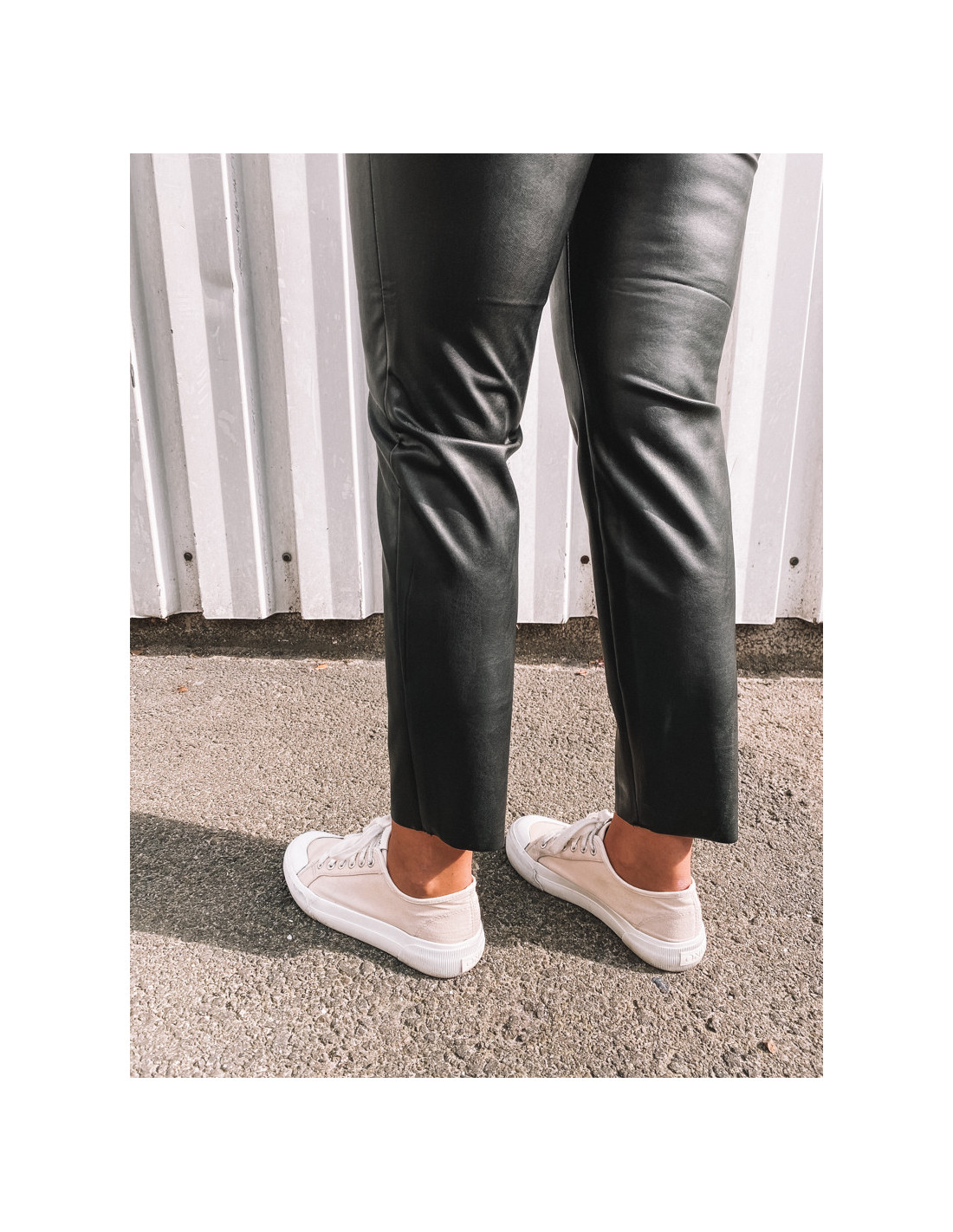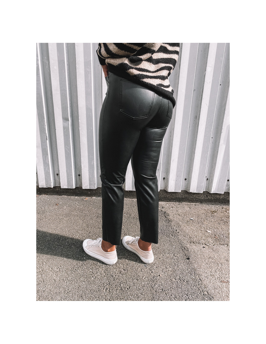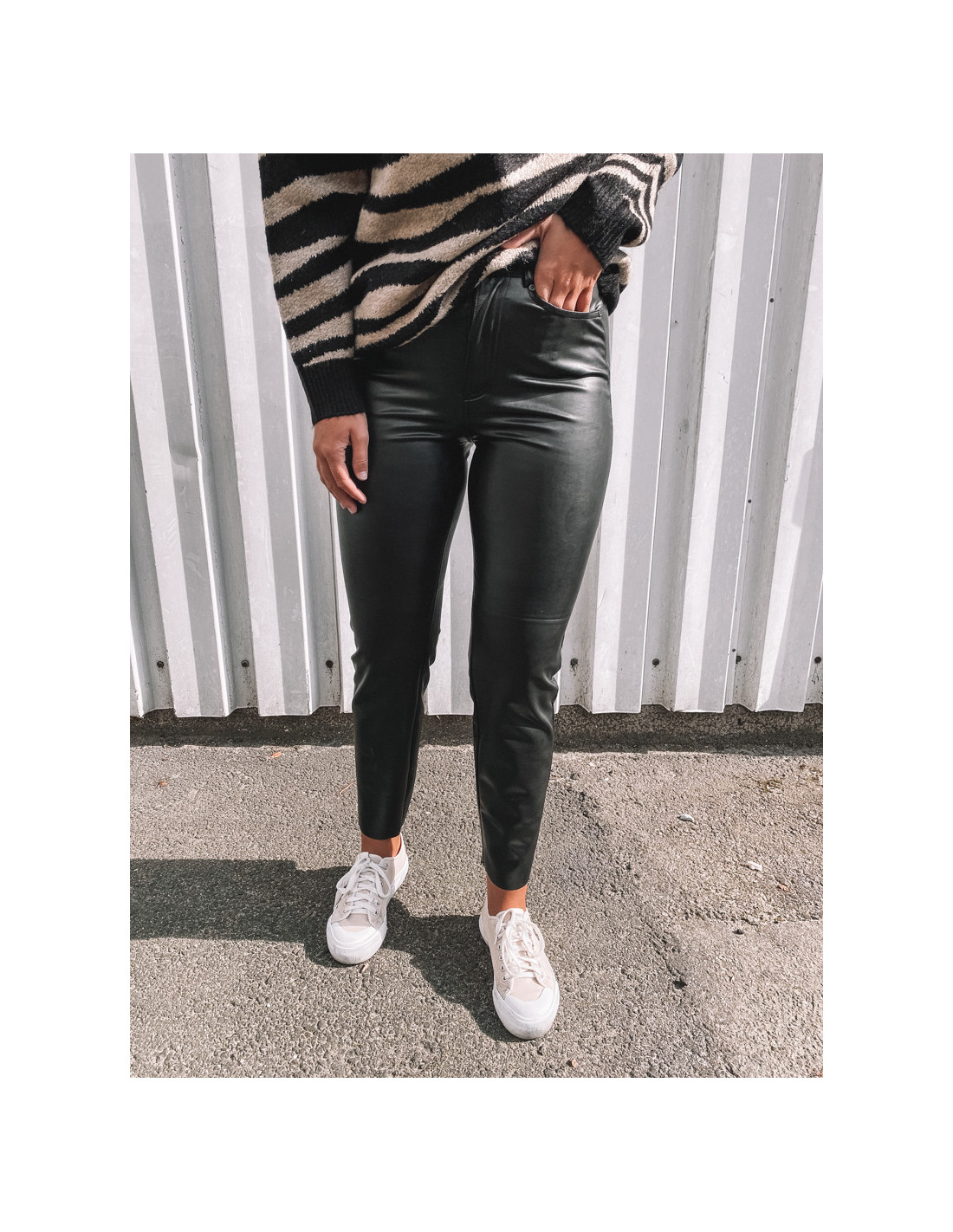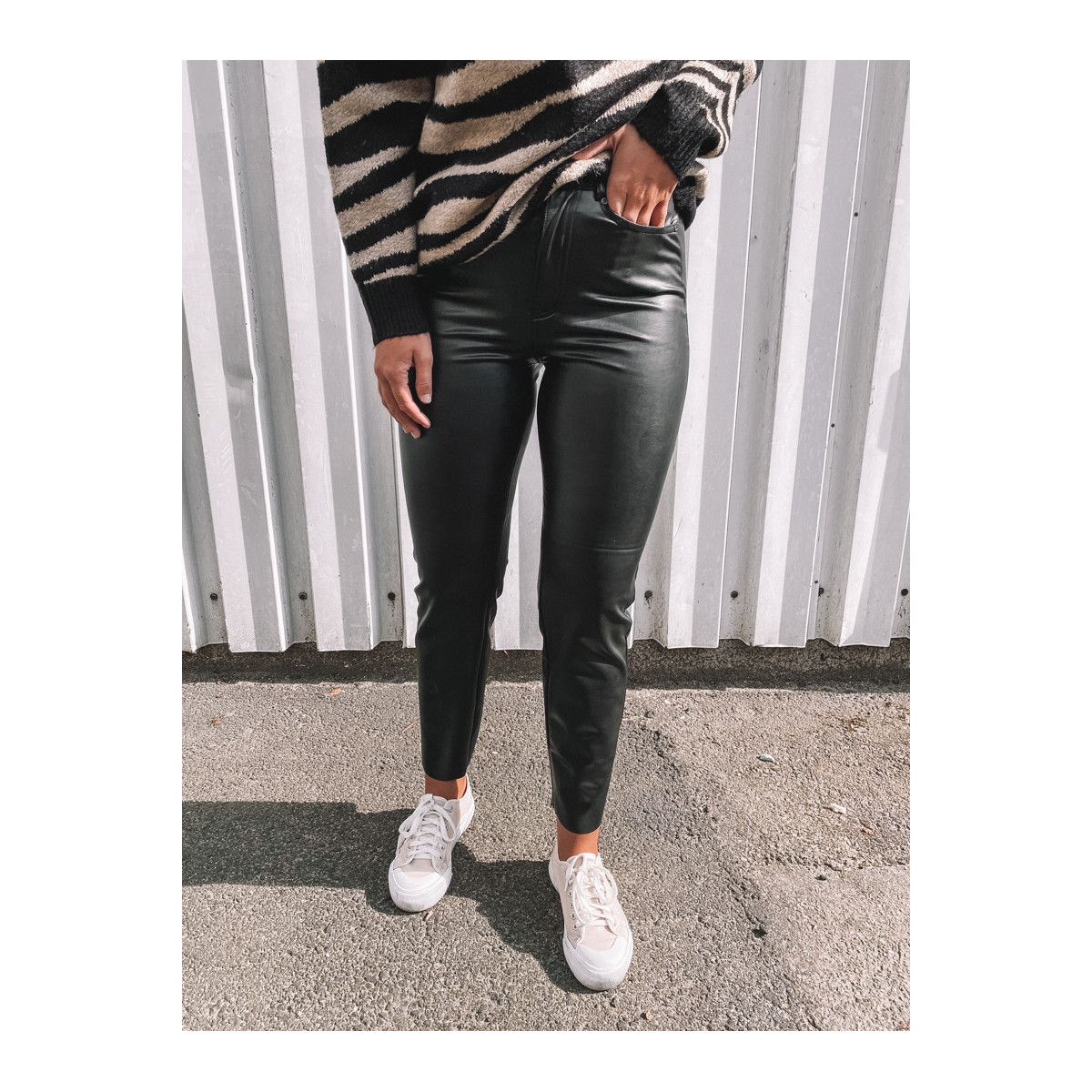 WOW! Äntligen är storfavoriten är igen - i skinnimitation! Byxan är högre i midjan och har en något rakare passform. Hällor i midjan och klassisk femficksmodell. Väldigt mjukt och stretchigt material. Normala till lite rymliga i storleken.