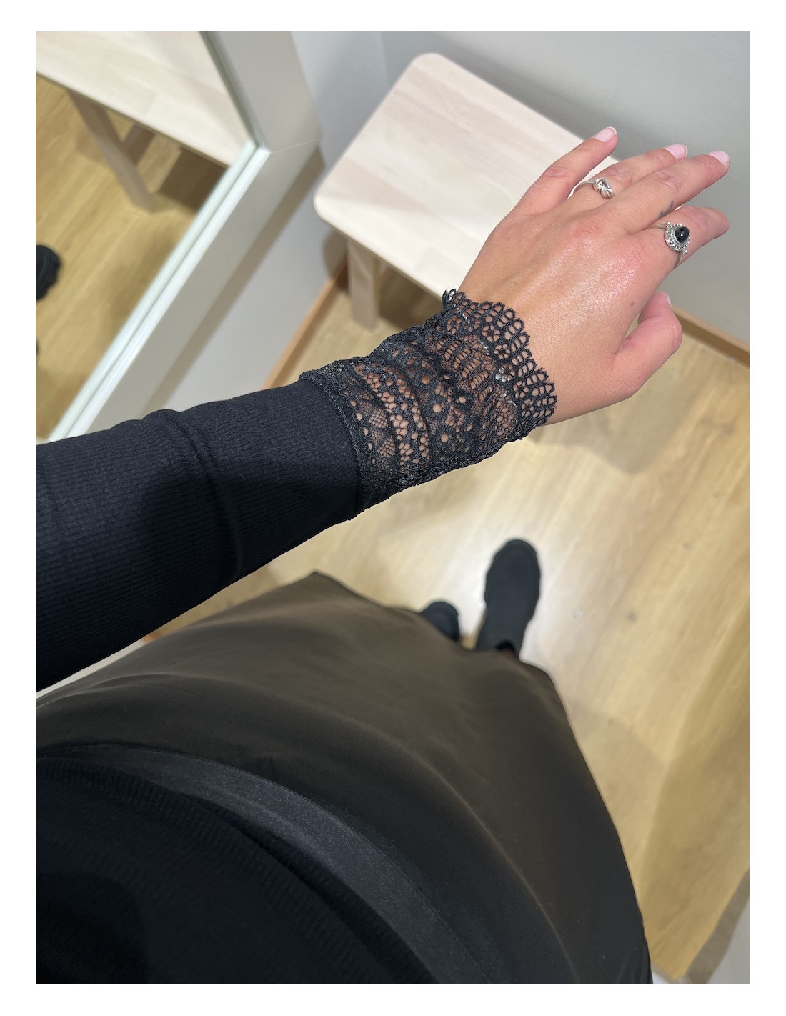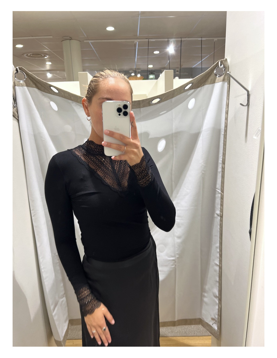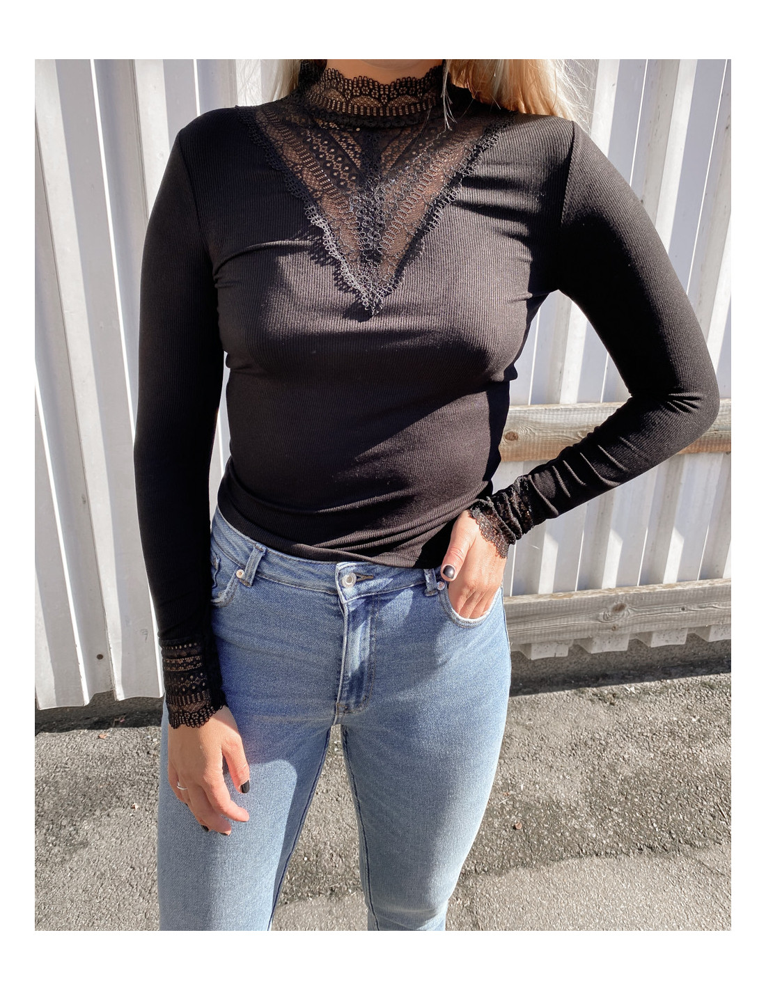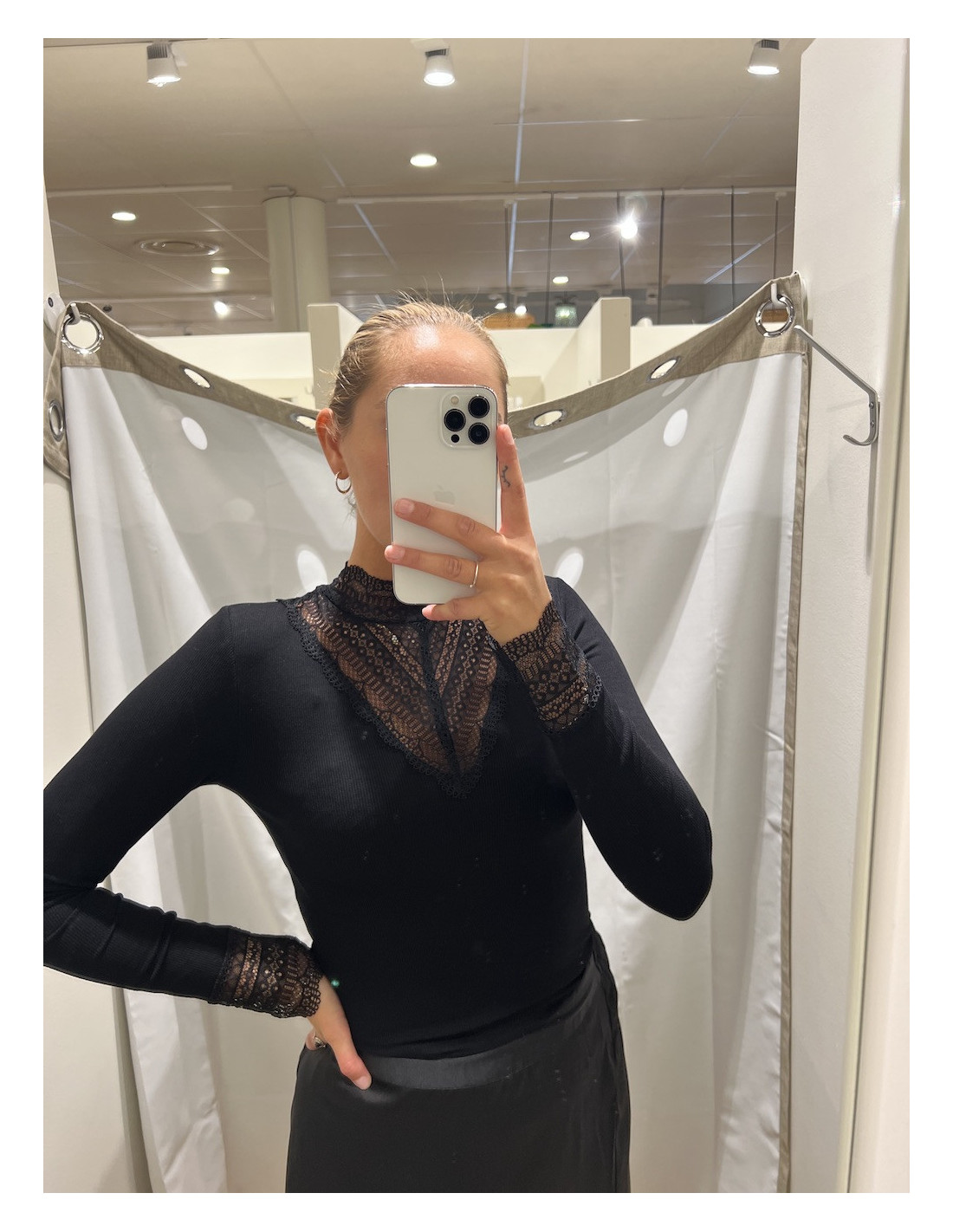 Långärmad tröja i ribbat stretchigt material. Spetsdetaljer vid hals, på ärm och baktill. Fin att ha under stickad tröja så att spetsdetaljer syns. Kajsa bär storlek M. Tight modell, men väldigt stretchig och skön.