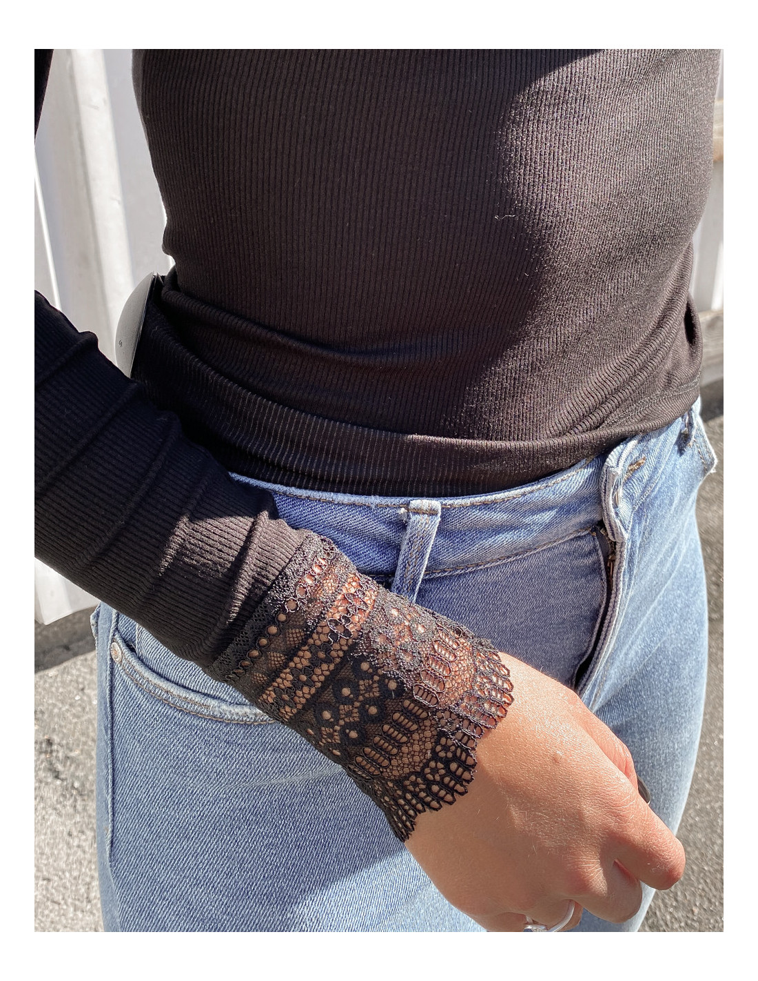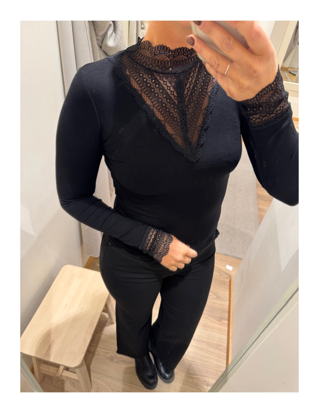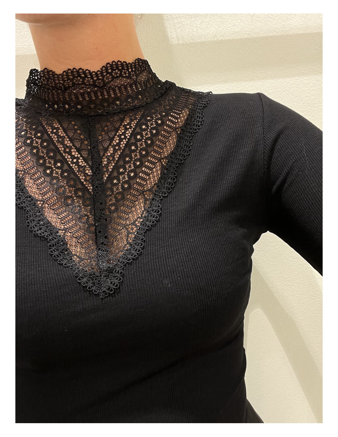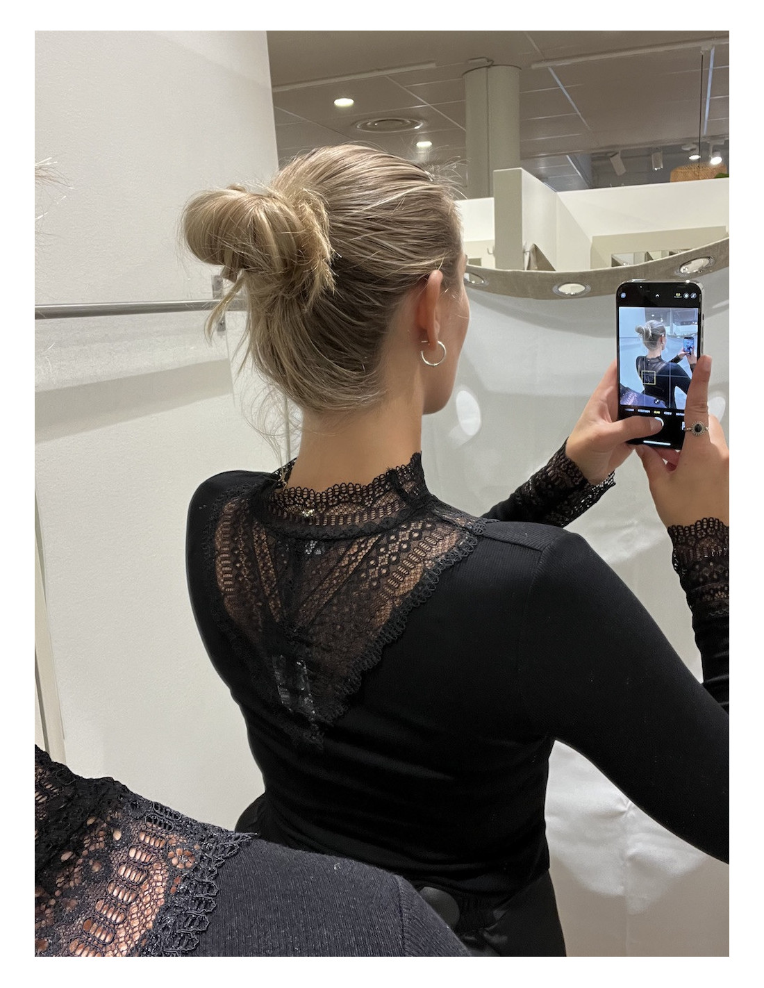 Långärmad tröja i ribbat stretchigt material. Spetsdetaljer vid hals, på ärm och baktill. Fin att ha under stickad tröja så att spetsdetaljer syns. Kajsa bär storlek M. Tight modell, men väldigt stretchig och skön.