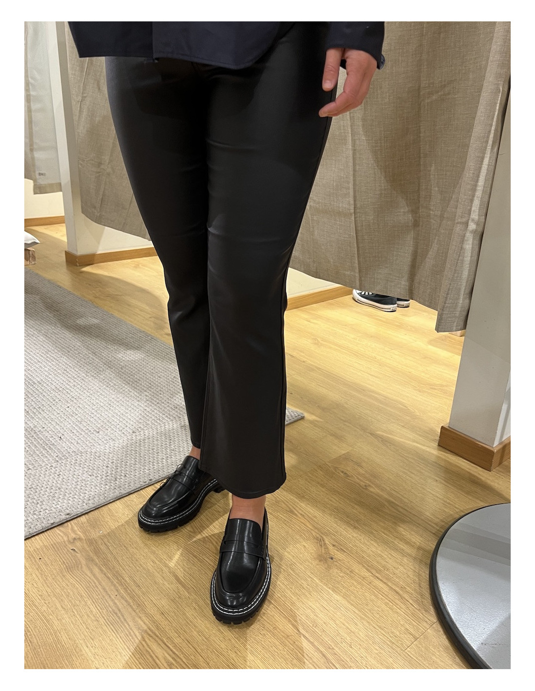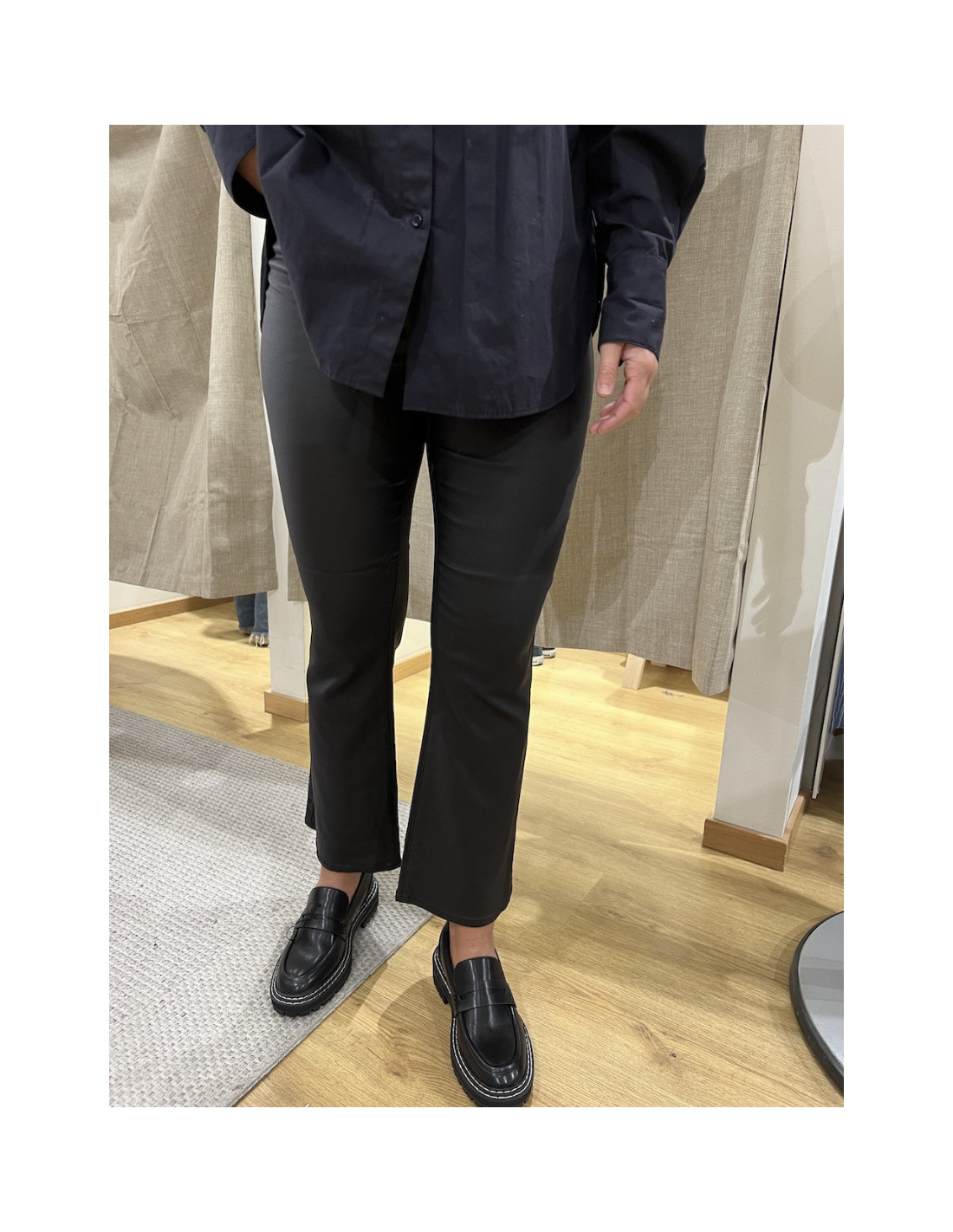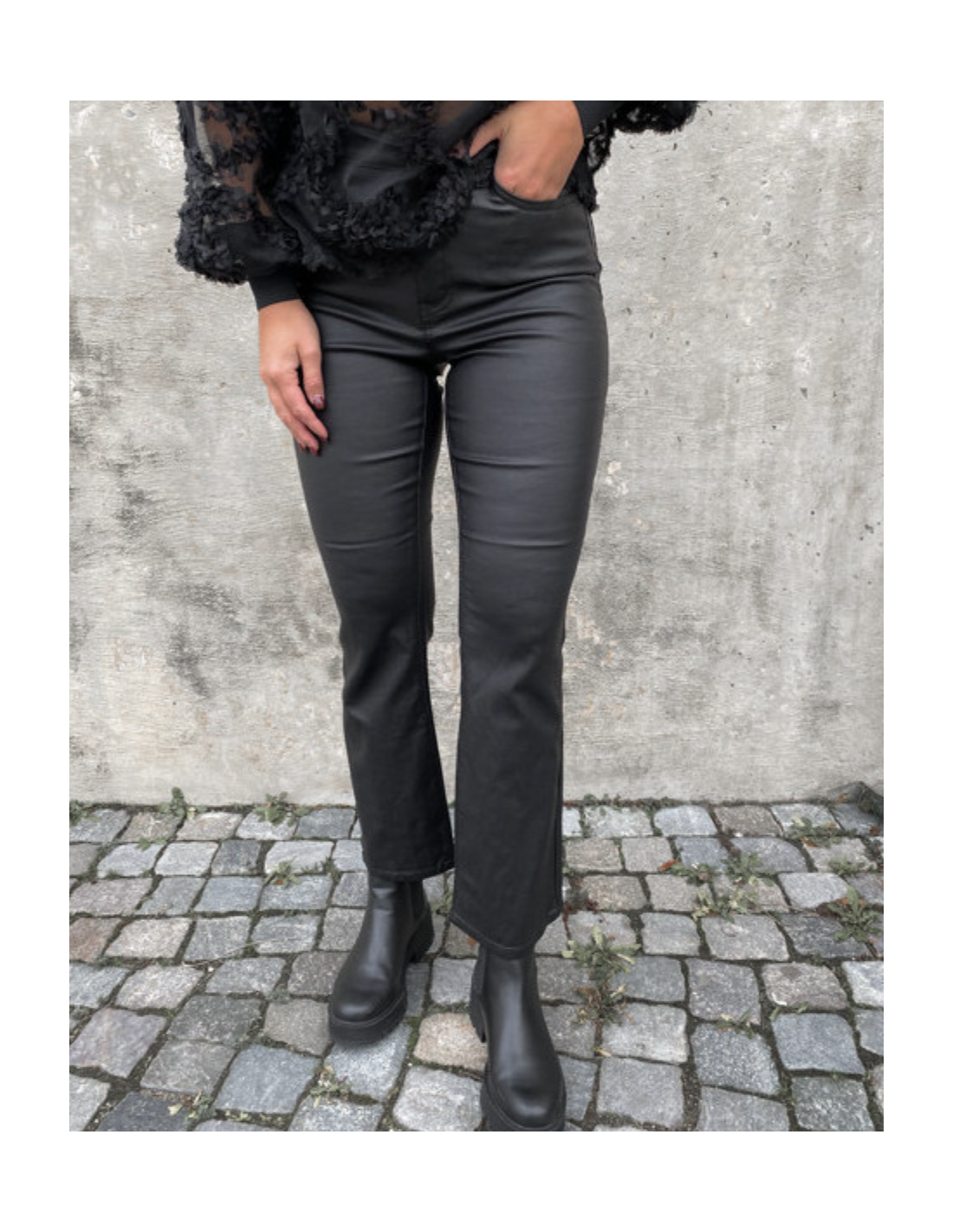 Byxor objBelle MW 7/8 Coated Flared Pant i stretchkvalitet med coatad yta. Smal passform över låren och utställda benslut. Gylf med dragkedja och knapp. Fem fickor. Beninnerlängd ca 71 cm i stl S.