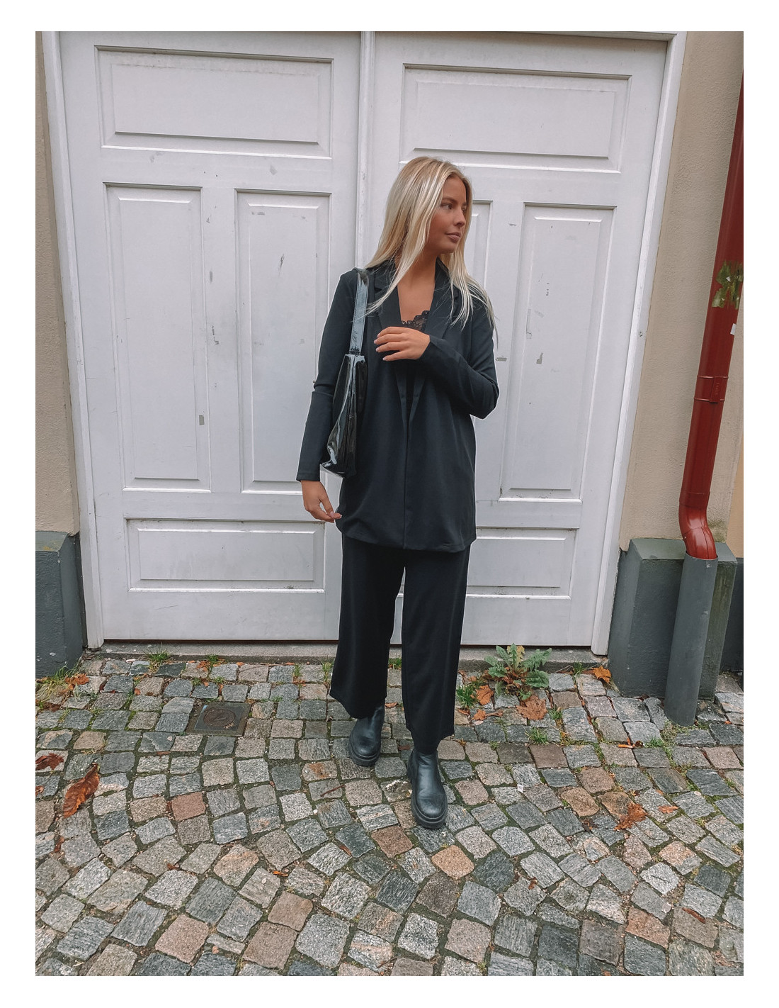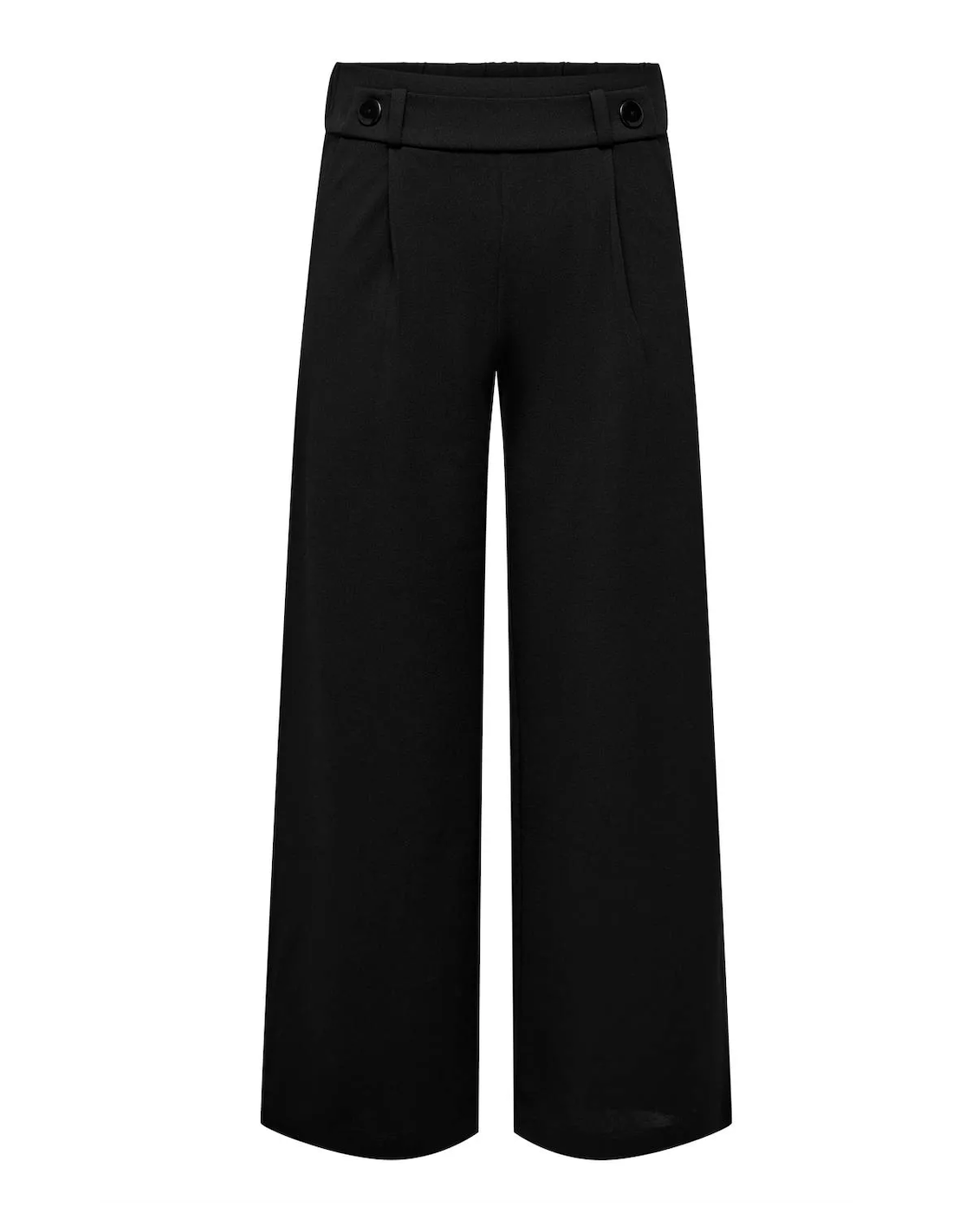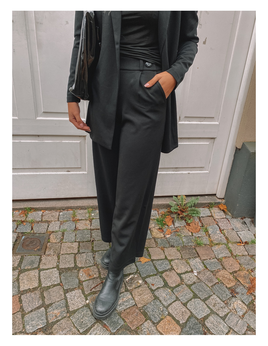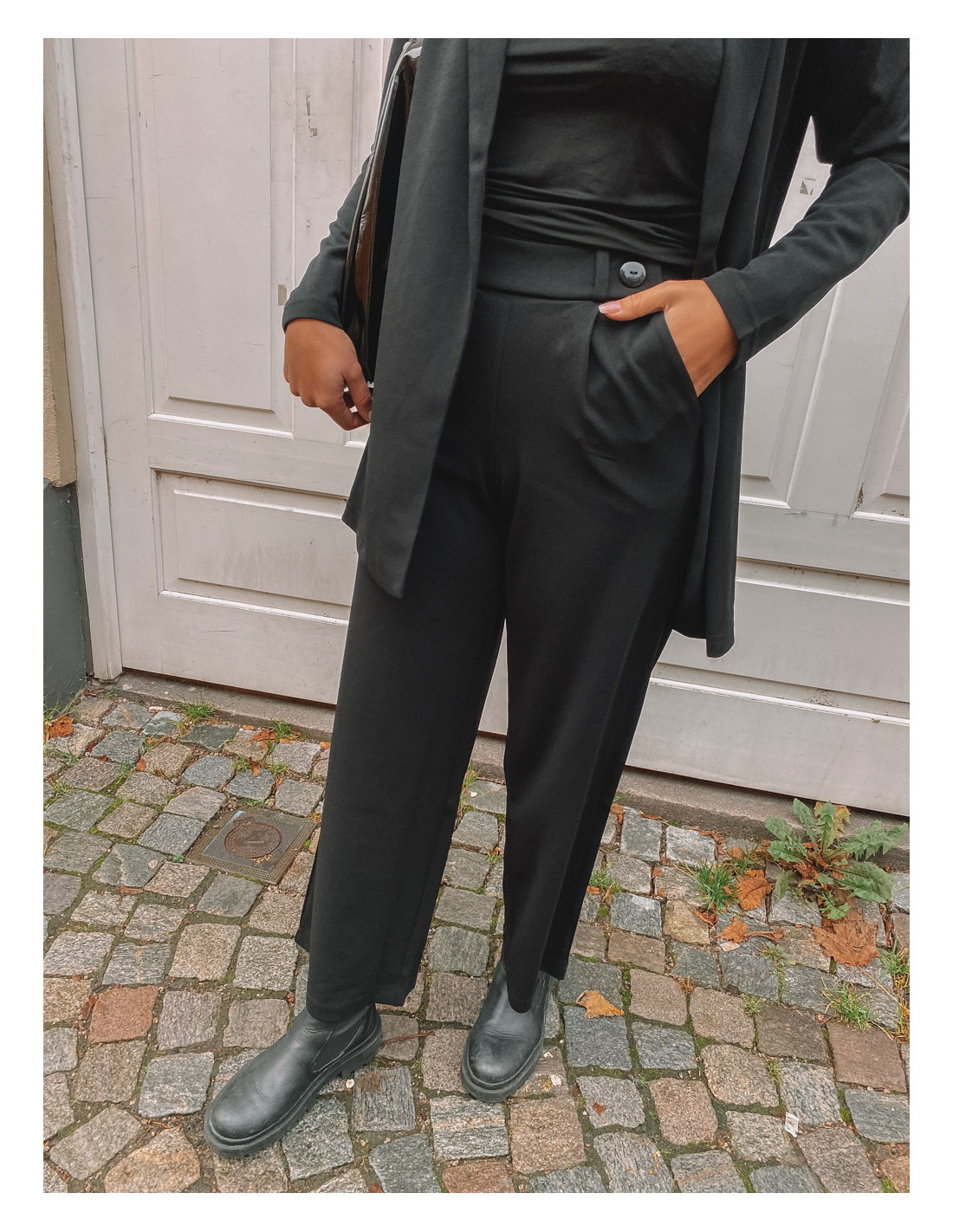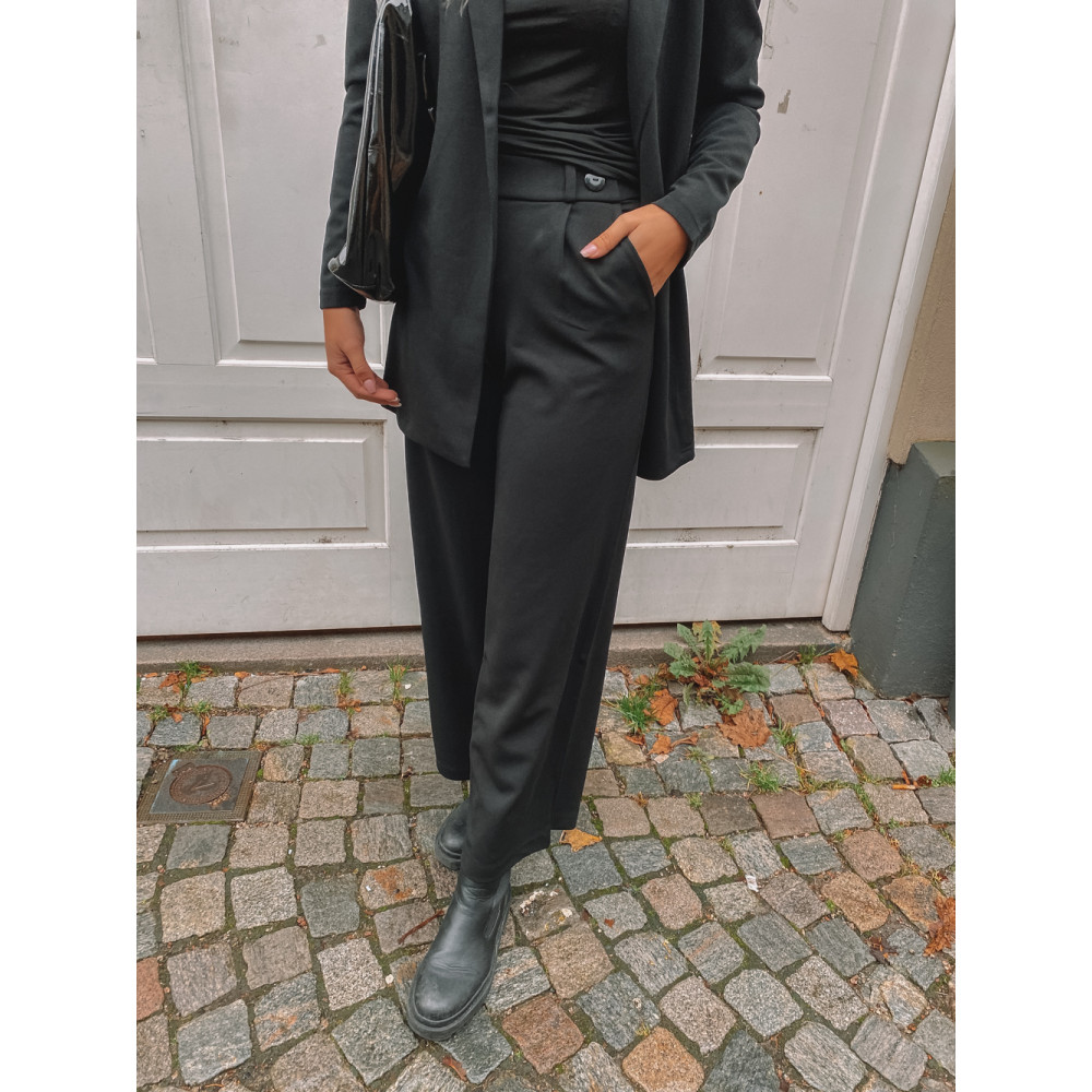 Benen är vida hela vägen men får ändå en lite utsvängd look eftersom midjan är lite slankare i jämförelse. Upptill fram är det diskreta sneda fickor medan det inte är några fickor baktill. Byxan är i ankellängd och benen är vida.