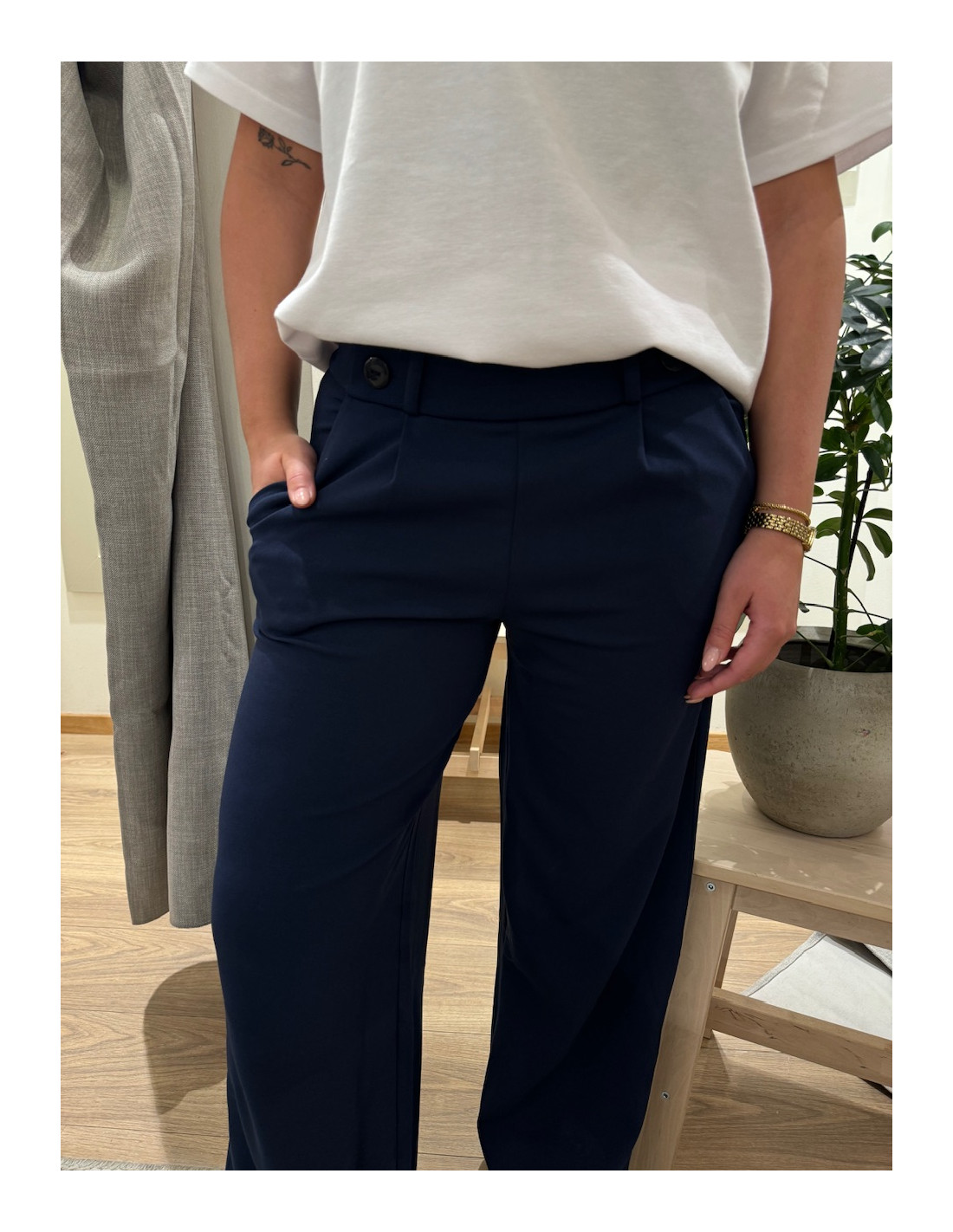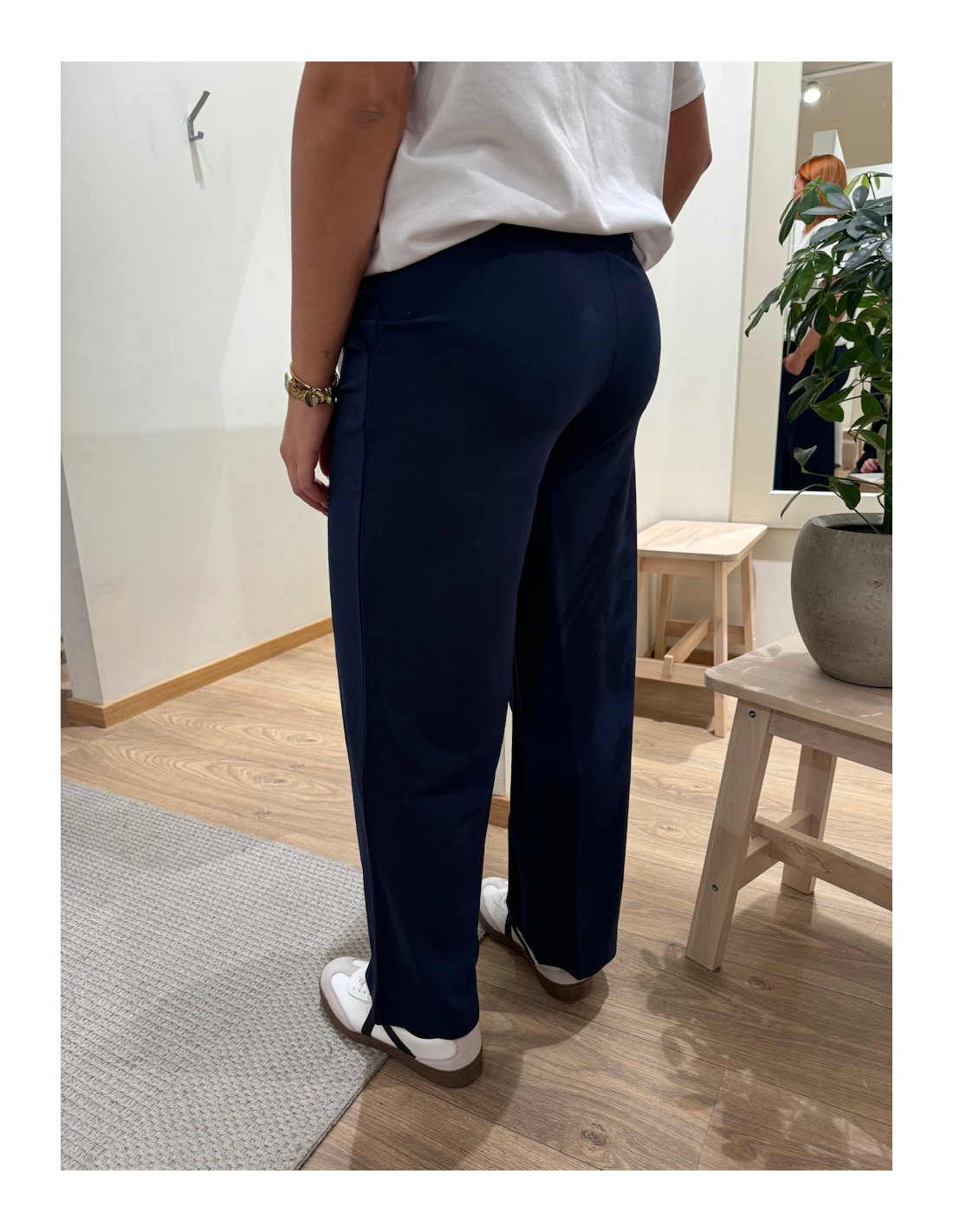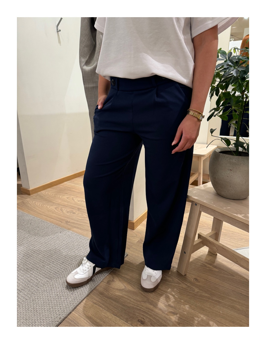 Benen är vida hela vägen men får ändå en lite utsvängd look eftersom midjan är lite slankare i jämförelse. Upptill fram är det diskreta sneda fickor medan det inte är några fickor baktill. Byxan är i ankellängd och benen är vida.
