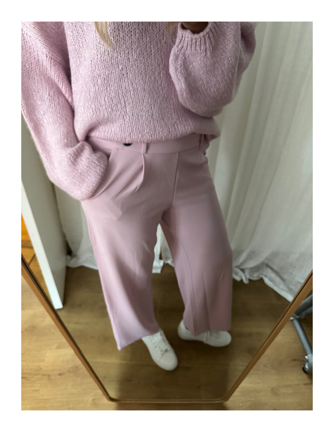 Benen är vida hela vägen men får ändå en lite utsvängd look eftersom midjan är lite slankare i jämförelse. Upptill fram är det diskreta sneda fickor medan det inte är några fickor baktill. Byxan är i ankellängd och benen är vida.