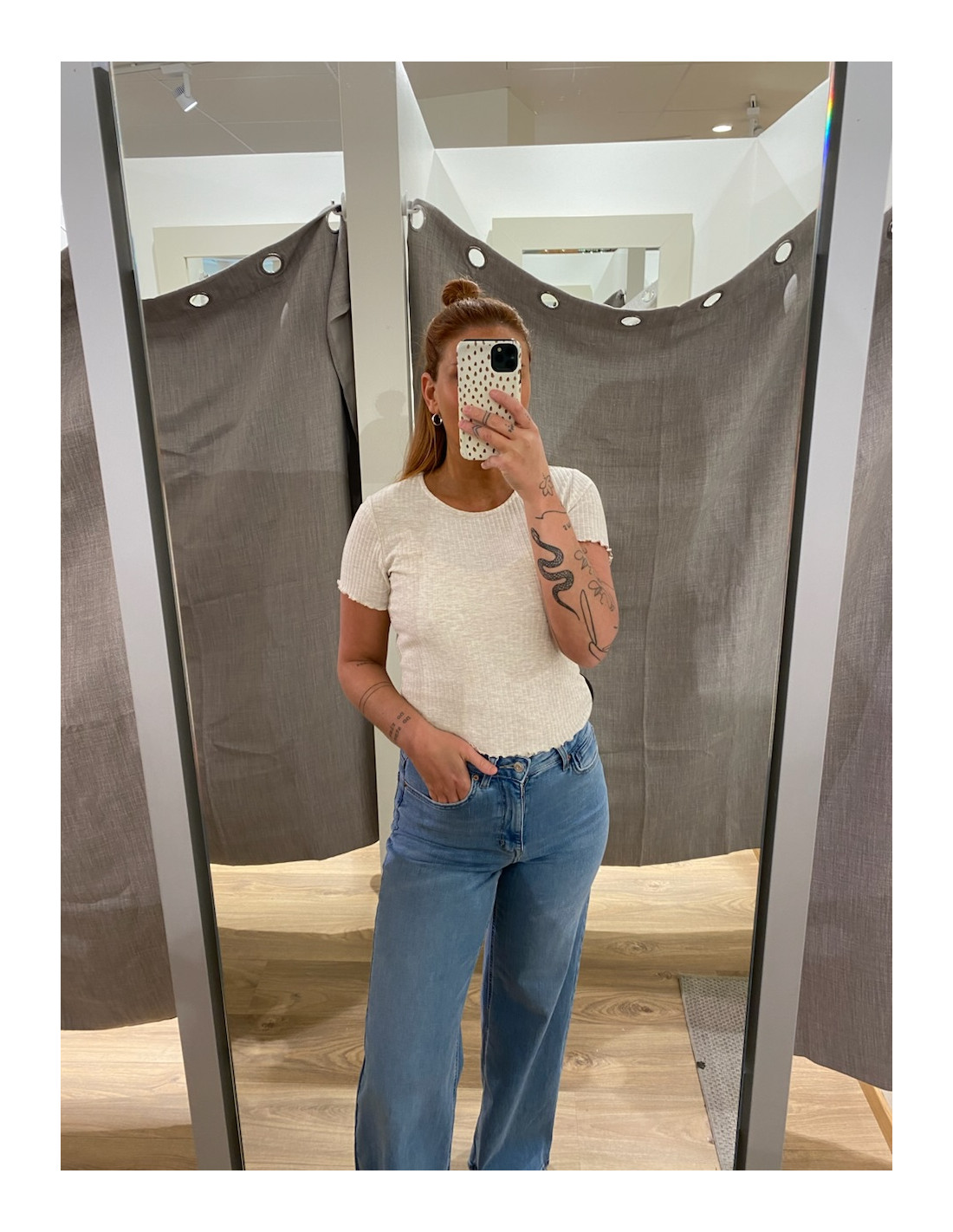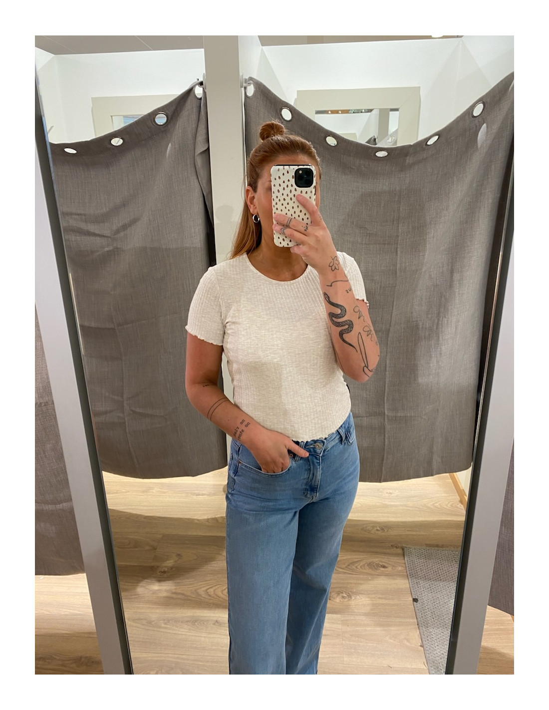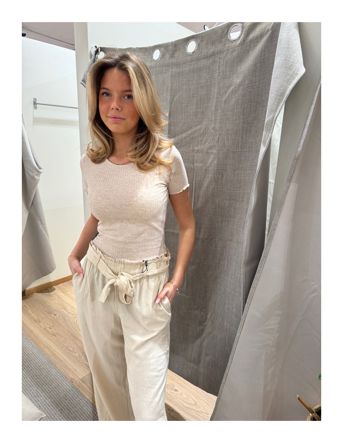 Ribbad t-shirt som är croppad i modellen. Den har volangdetaljer på ärmarna och nedtill. Stretchig och mjuk.