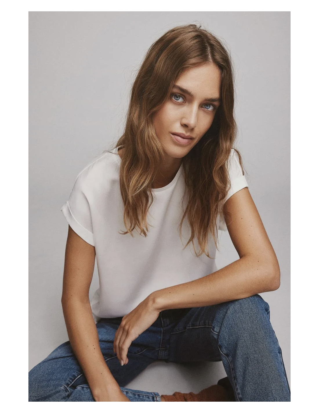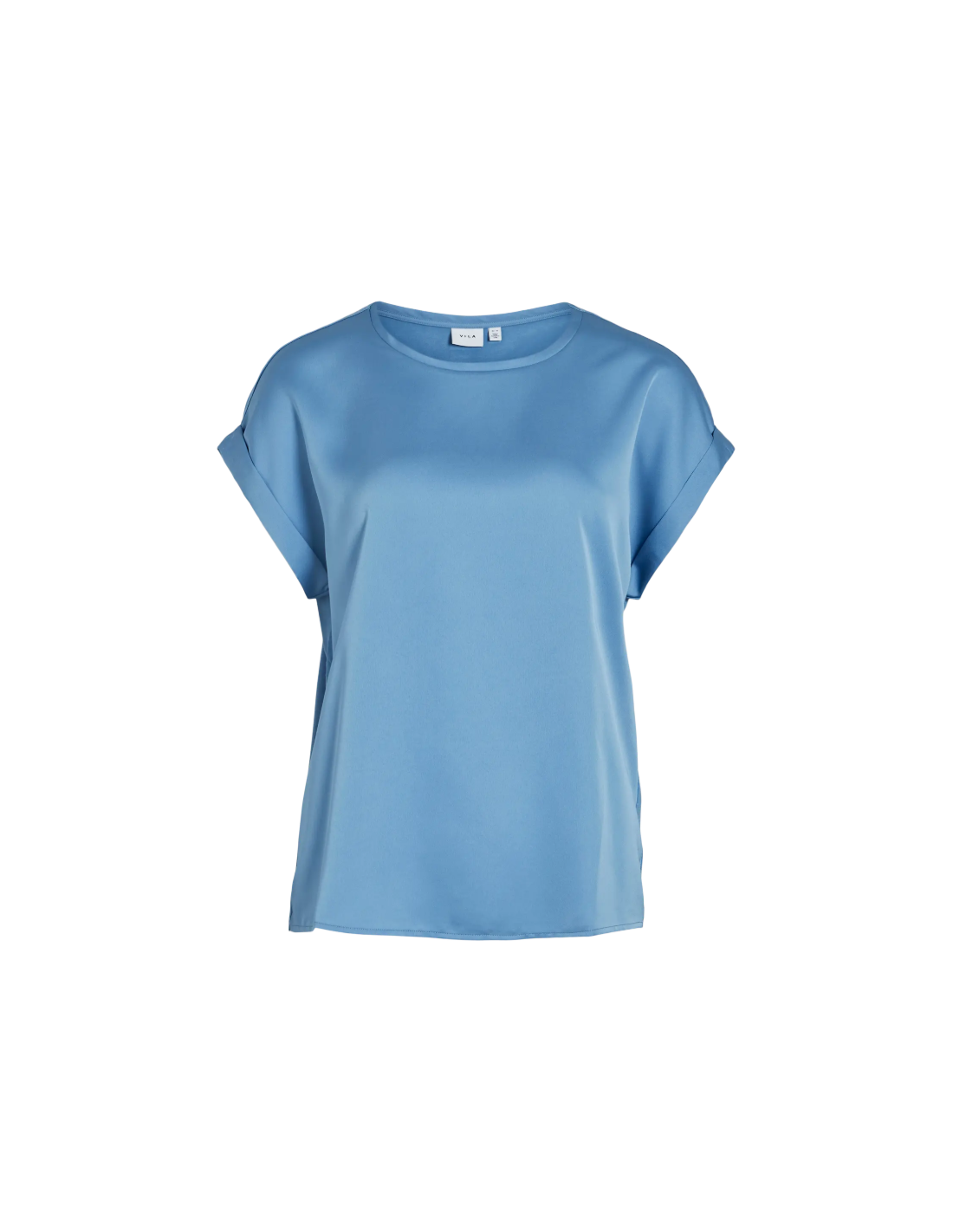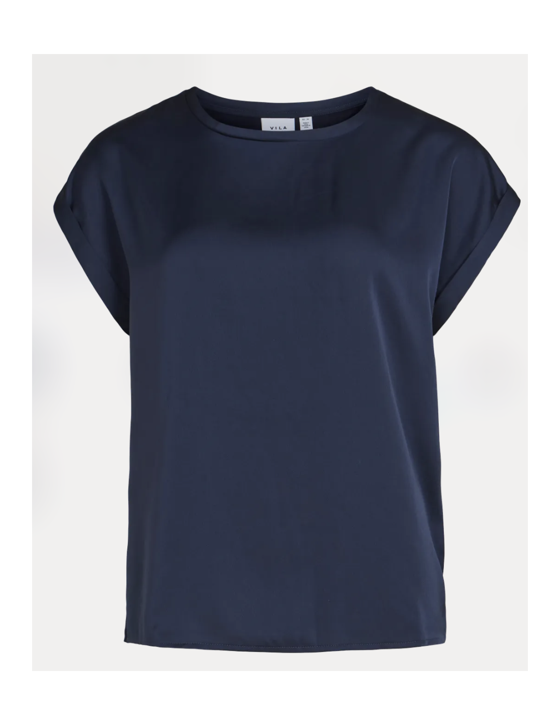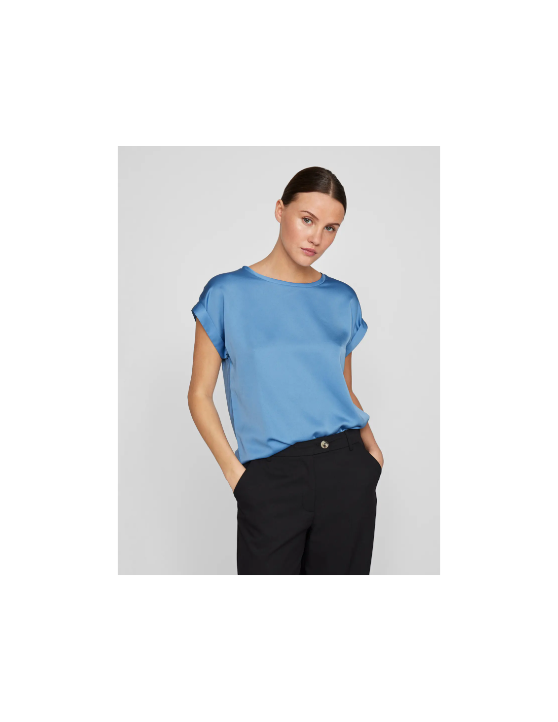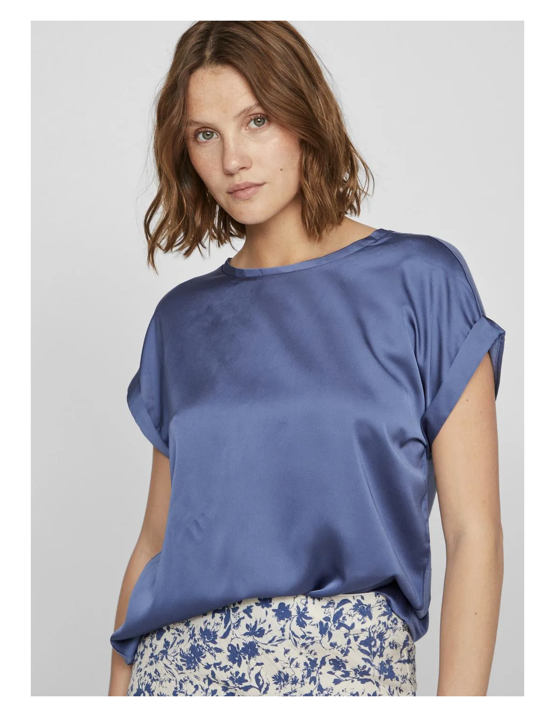 Kortärmad blus i satin med rund halsringning och uppsydda ärmslut.