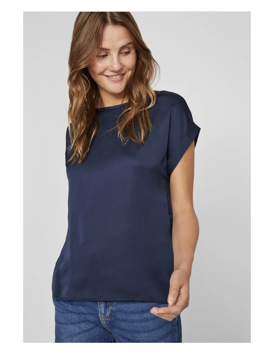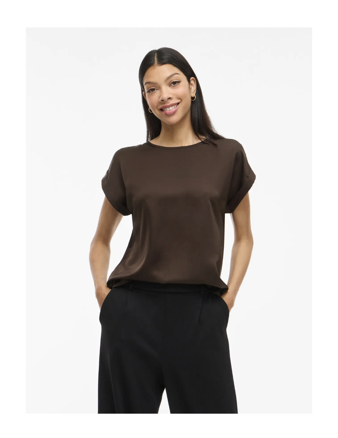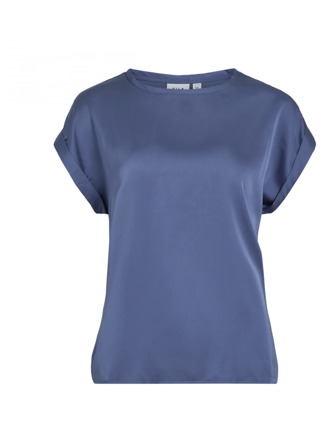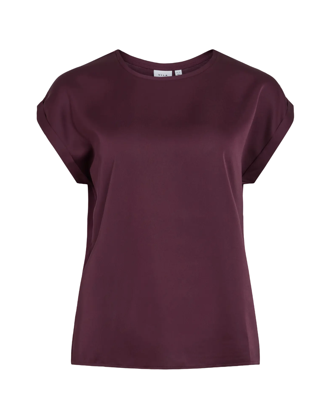 Kortärmad blus i satin med rund halsringning och uppsydda ärmslut.