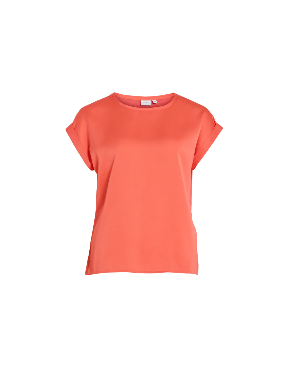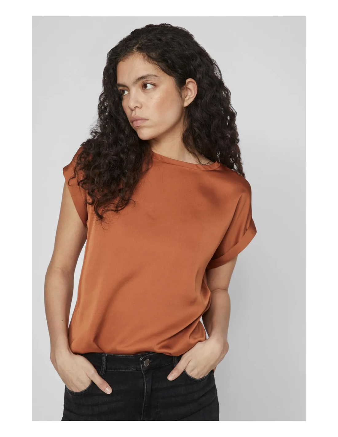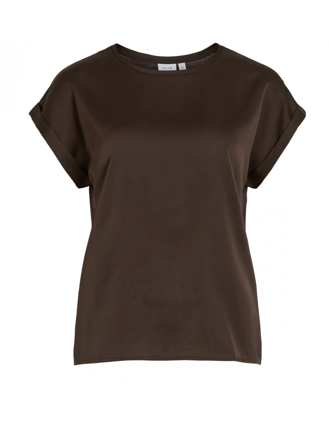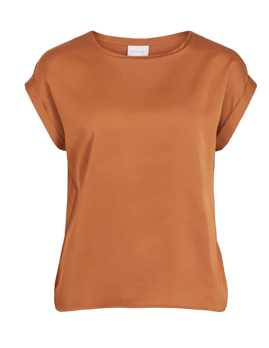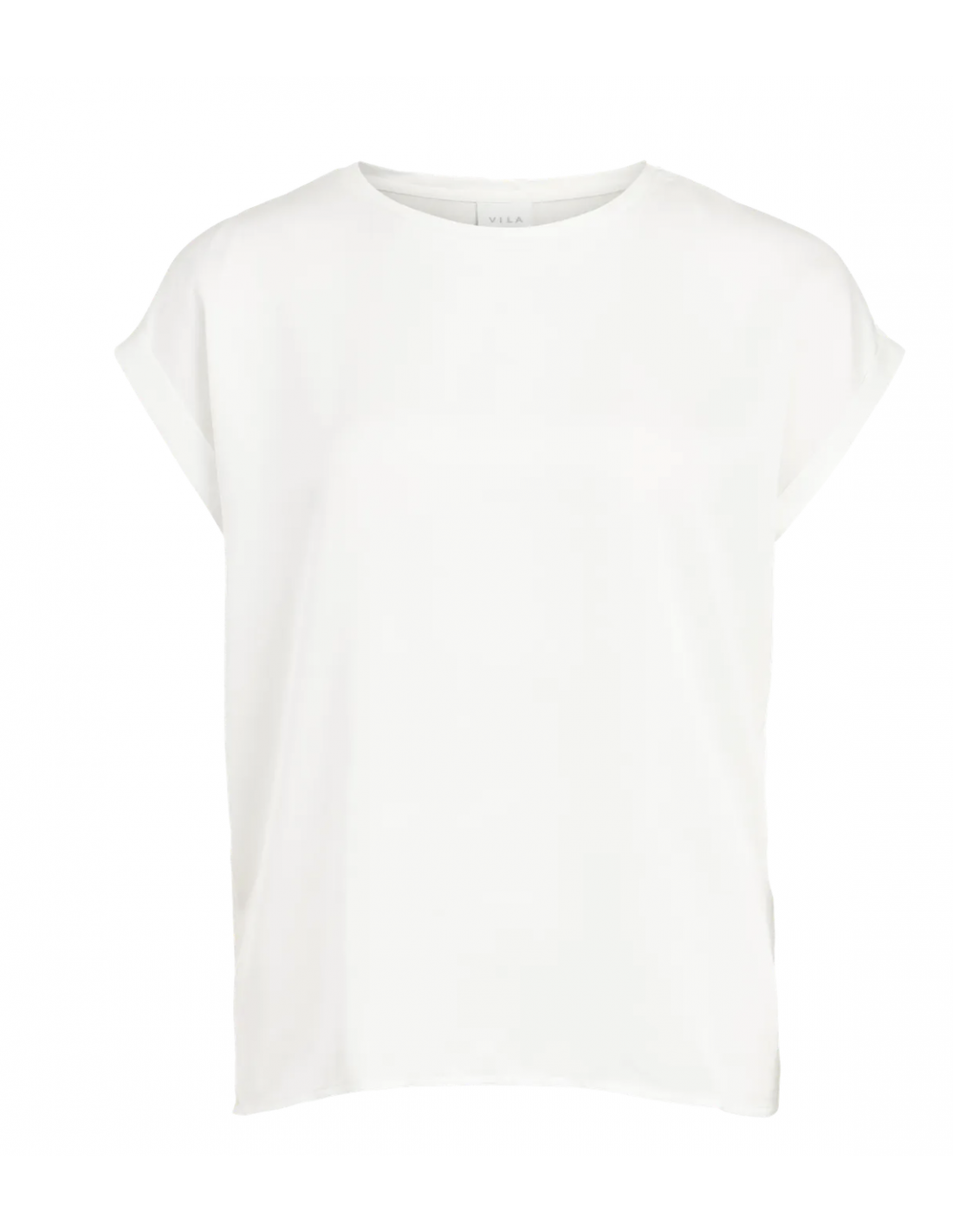 Kortärmad blus i satin med rund halsringning och uppsydda ärmslut.