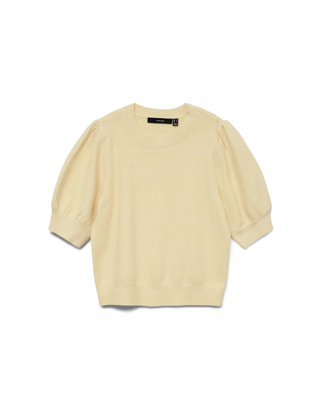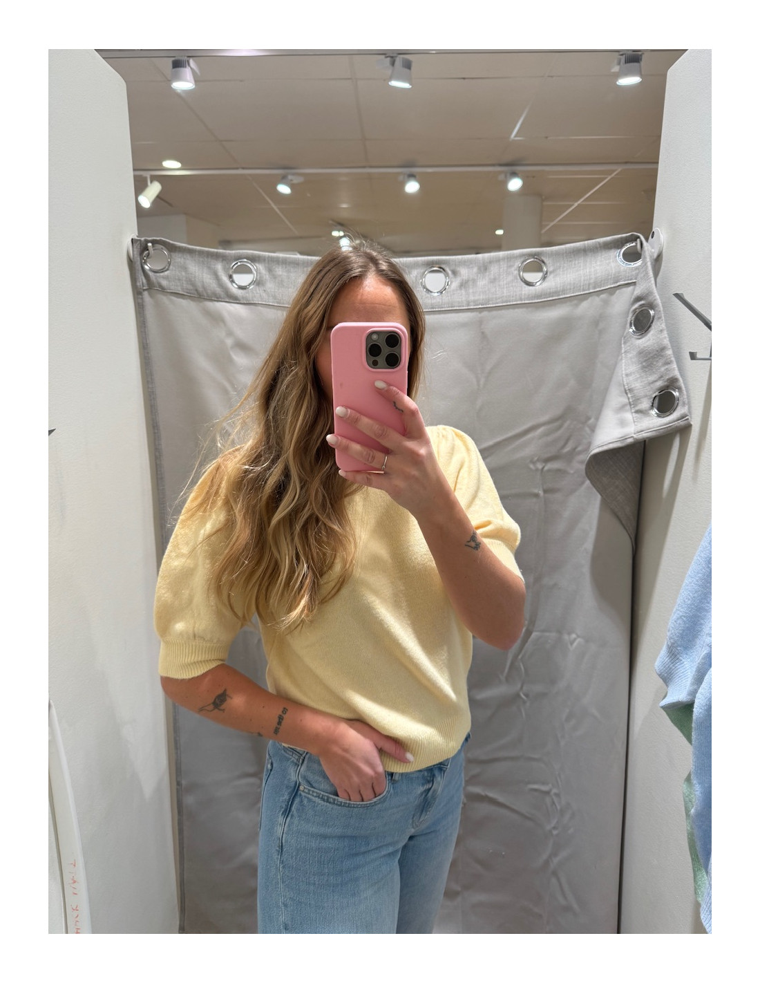 Stickad tröja med 3/4 ärm. Rundad hals och resår vid ärmslutet.