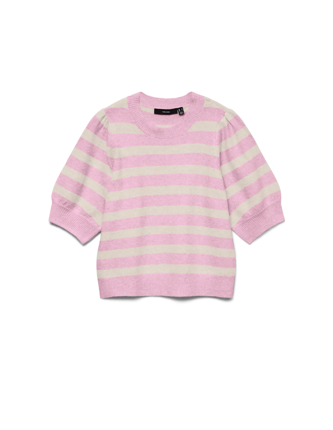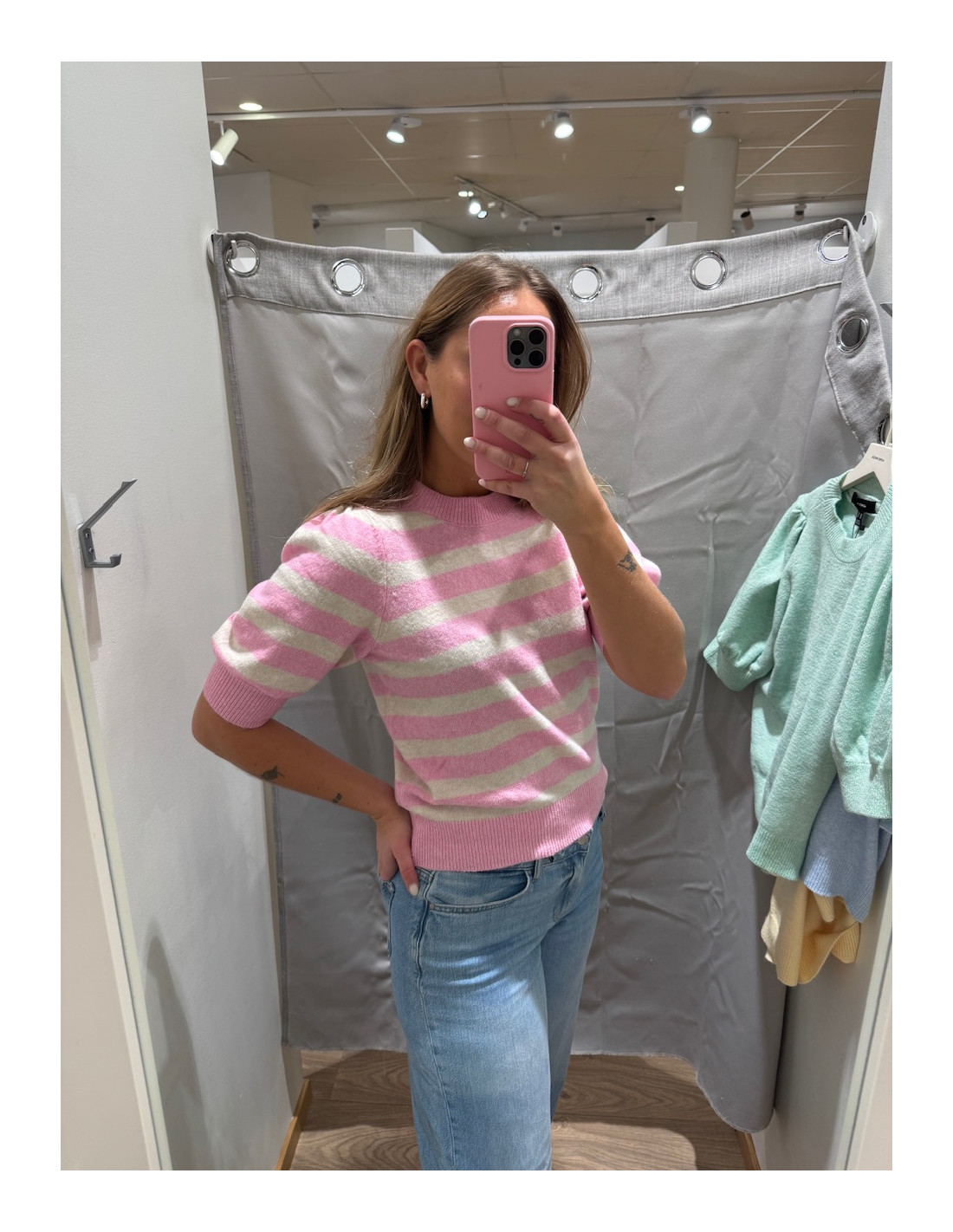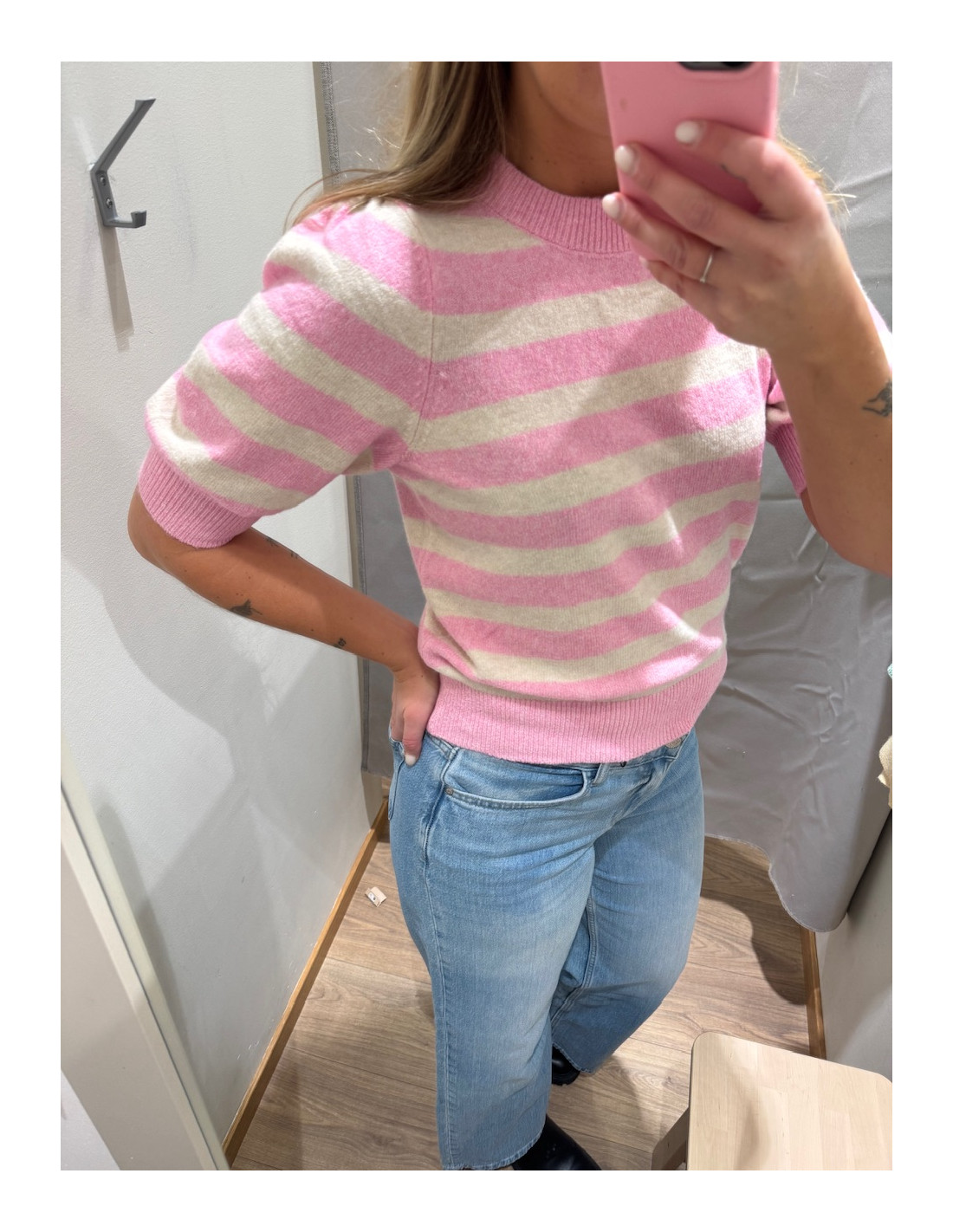 Stickad tröja med 3/4 ärm. Rundad hals och resår vid ärmslutet.