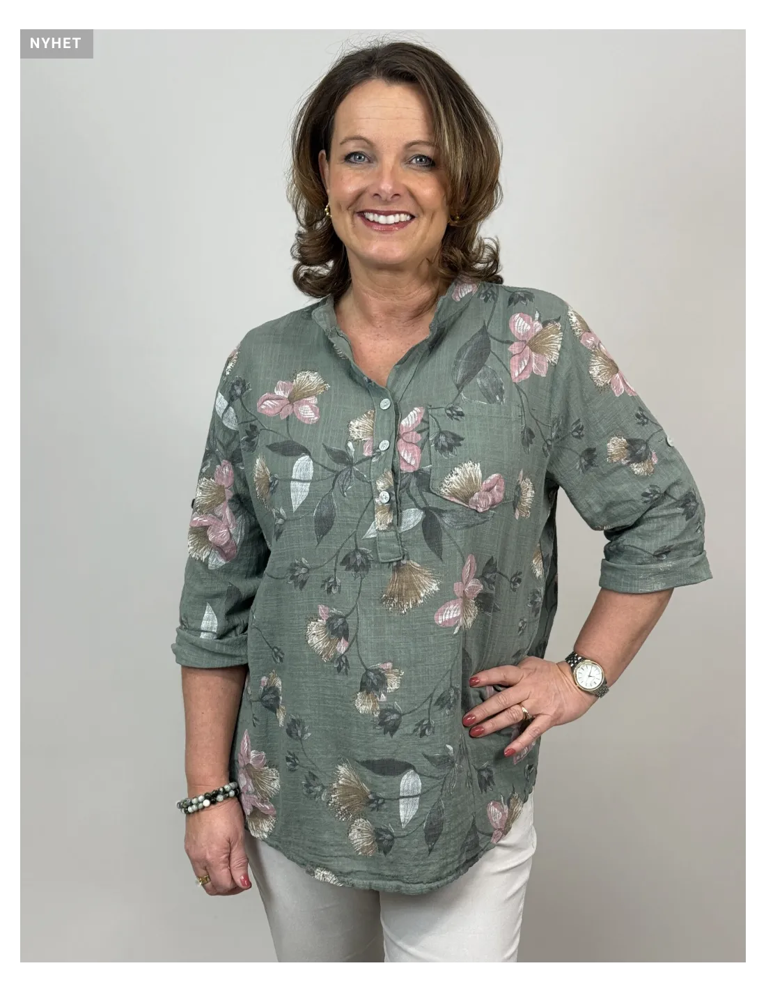 Mönstrad blus i med v-hals och 3 knappar, ficka på vänster bröst och ärm med knappslå.