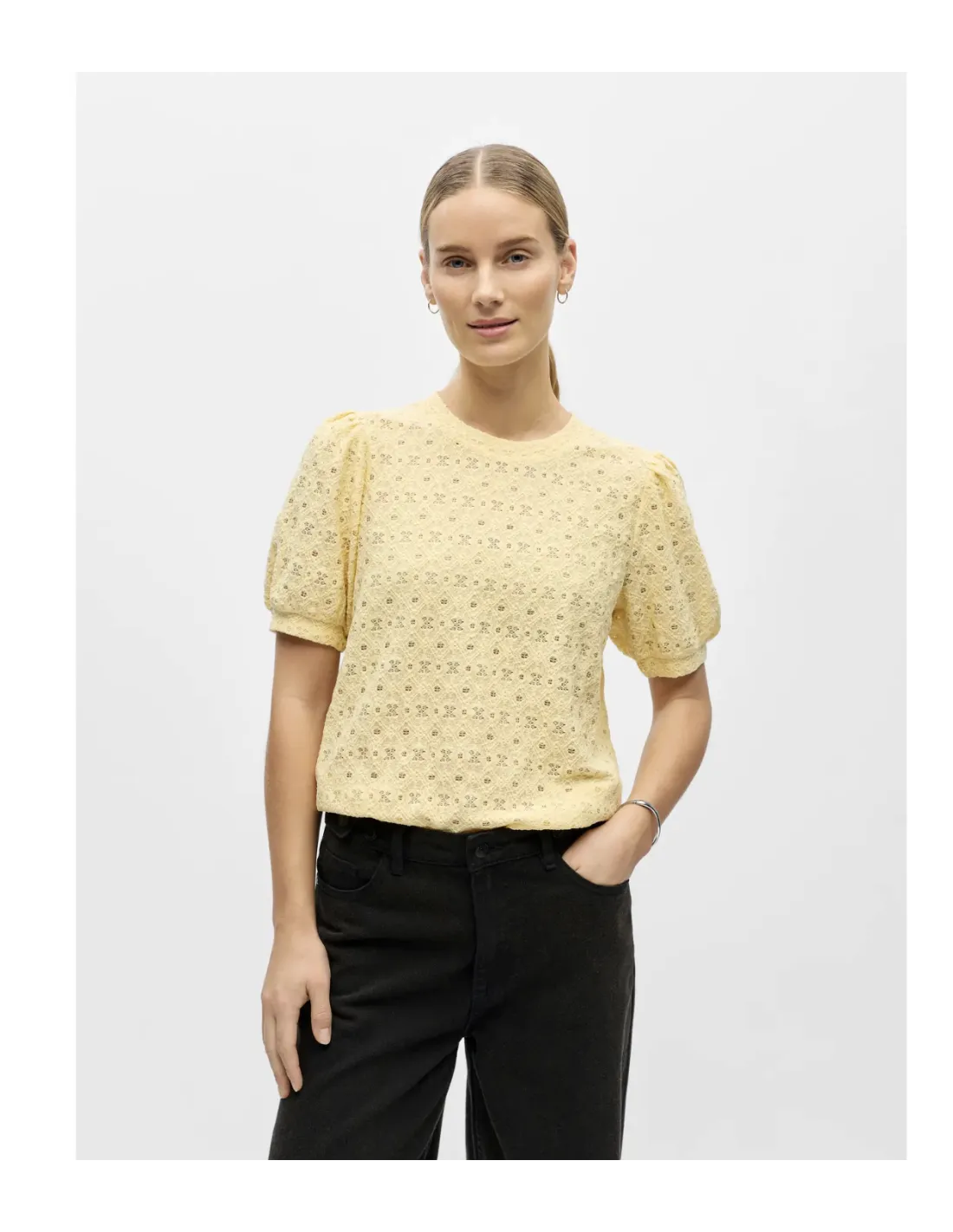 Spetstopp i mjuk stretchig kvalitet. Ballongärm med resår nedtill. Mjuk och skön.