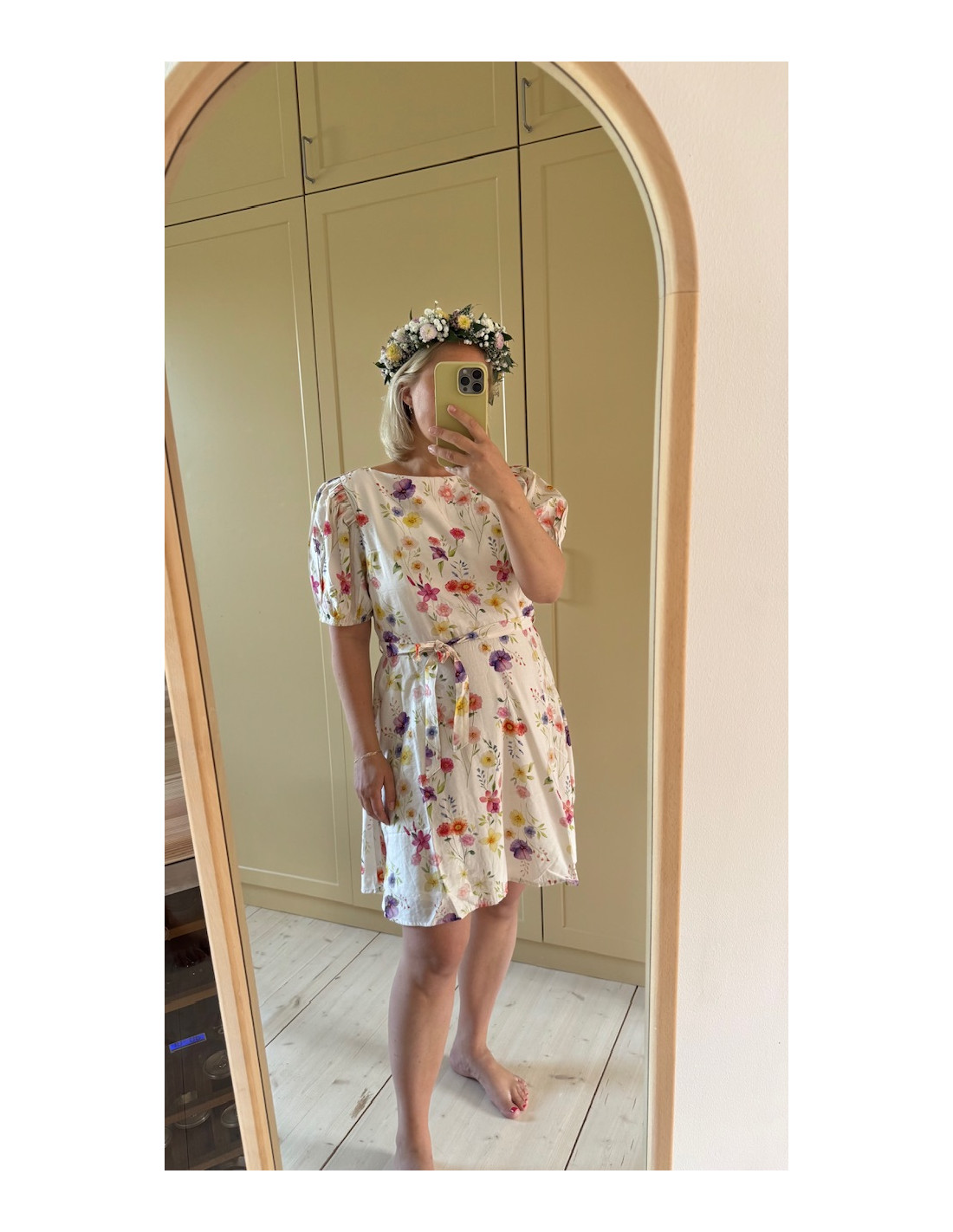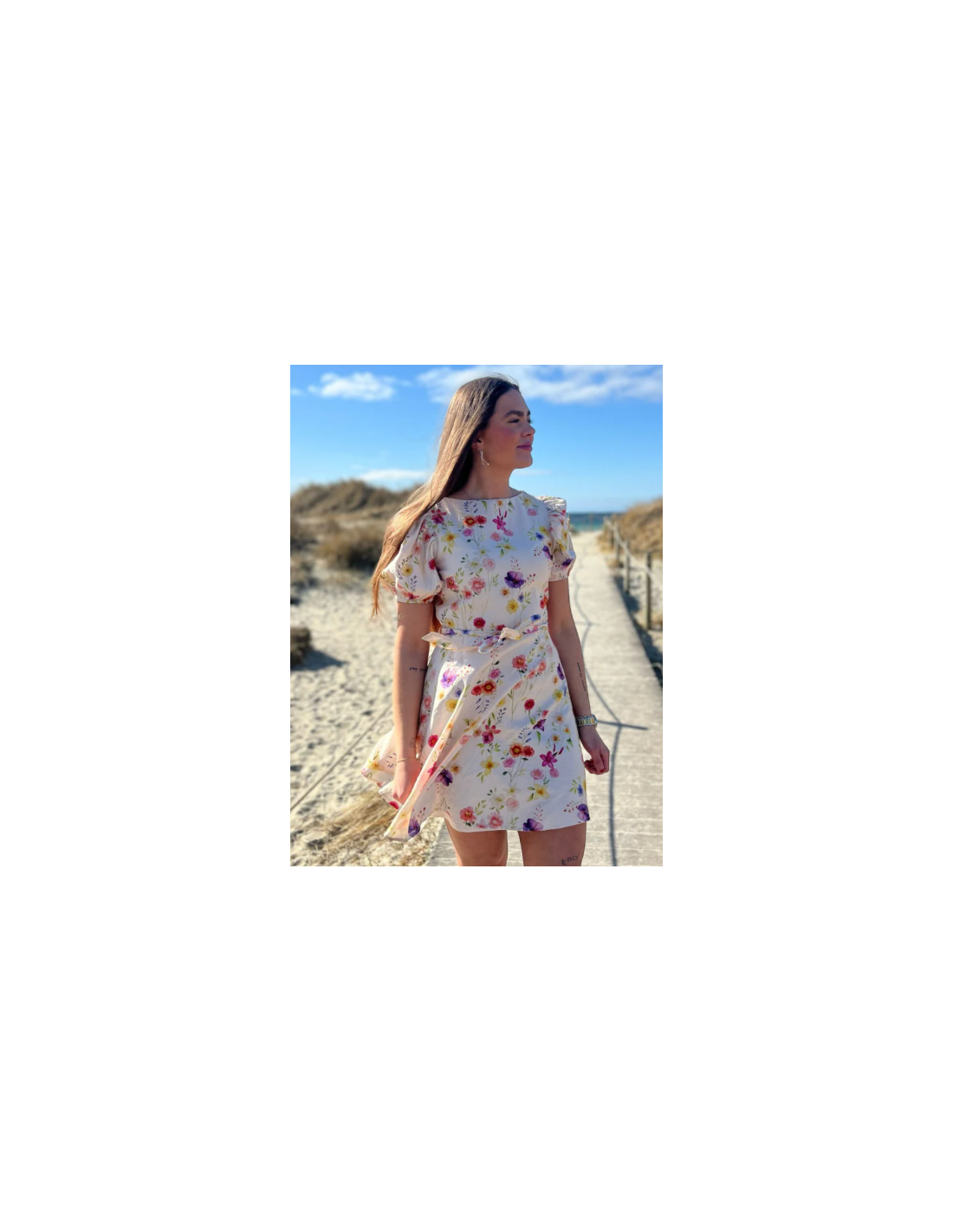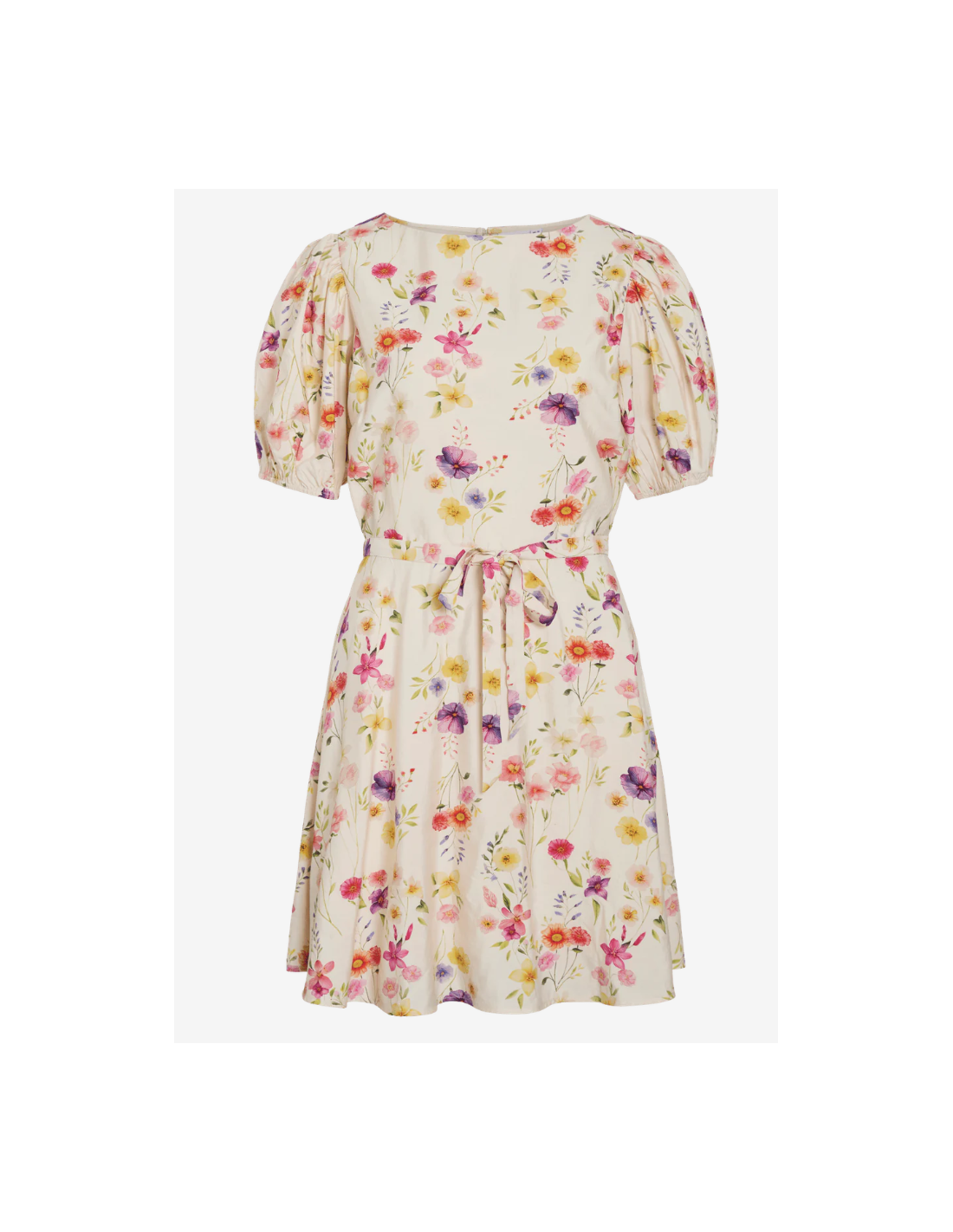 Klänningen är i en kortare modell och har resår i ärm slutet.