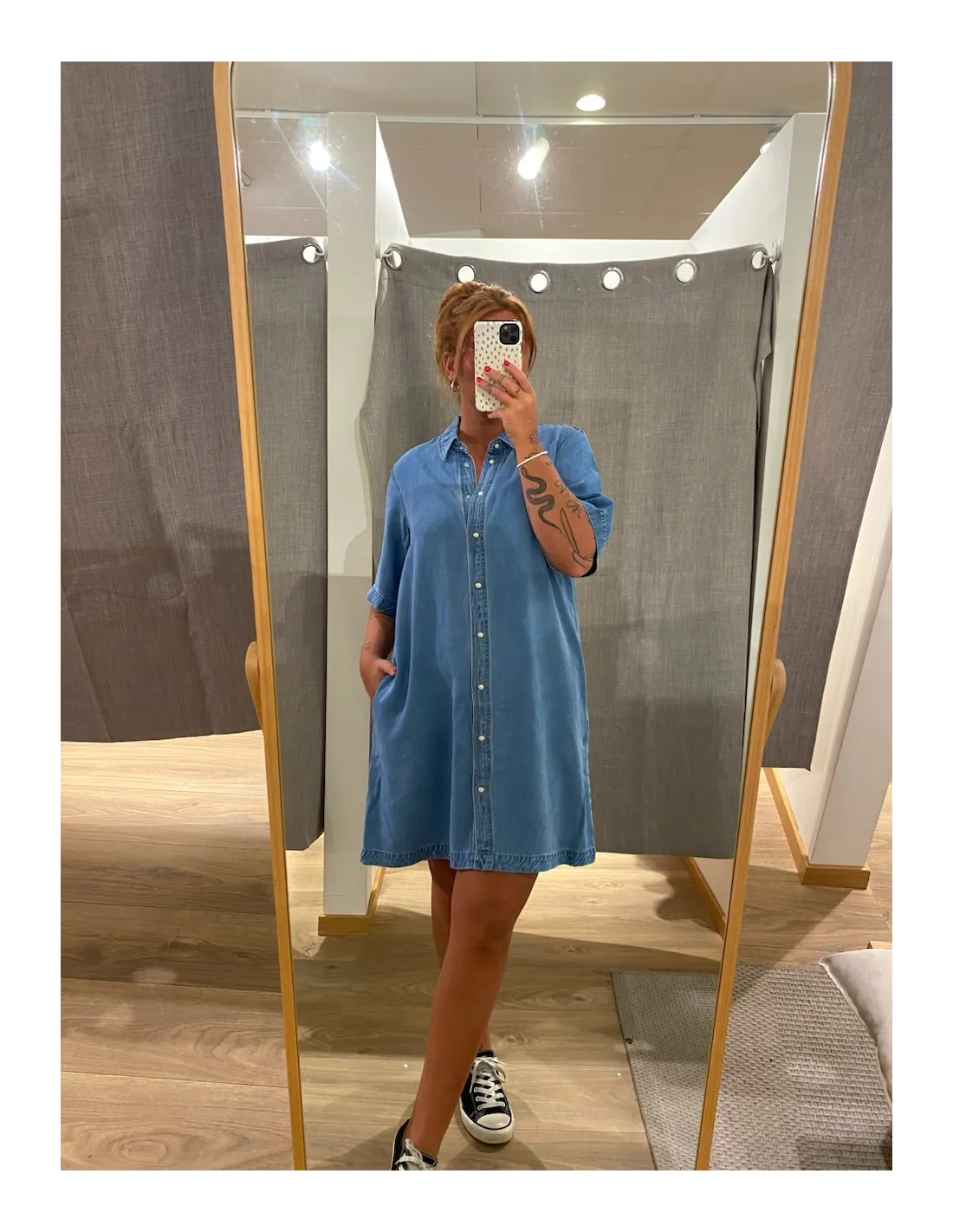 Jeansklänning med 2/4 dels ärm, i det mjukaste jeanstyget. Med fickor i sidan.
