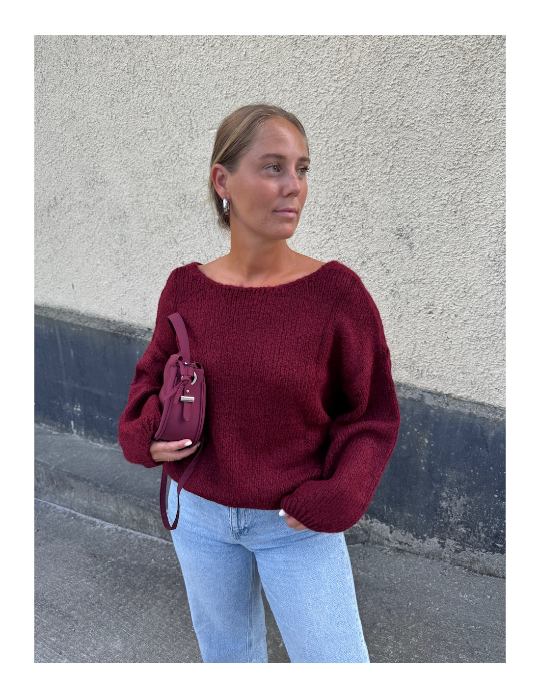Lång ballongärm med ribbstickning i ärmsluten och nerhasade axlar