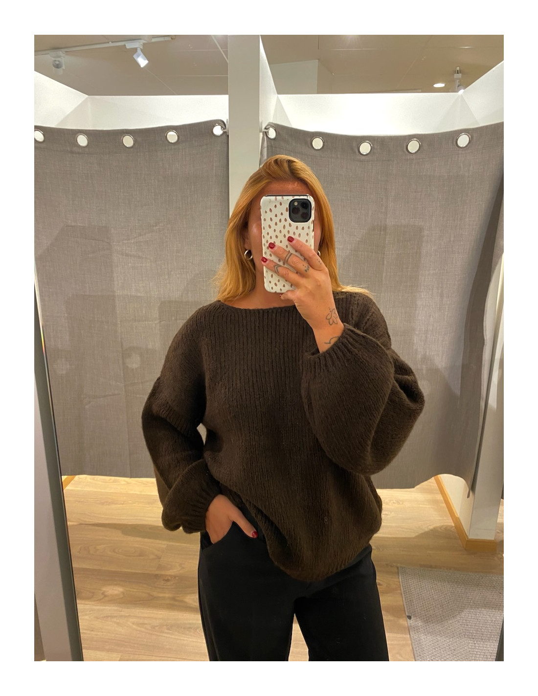 Lång ballongärm med ribbstickning i ärmsluten och nerhasade axlar