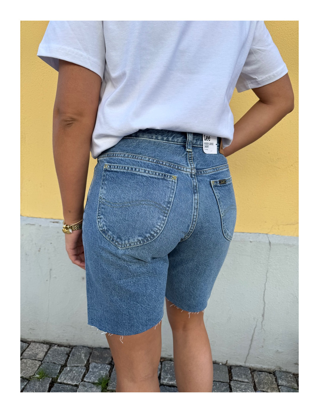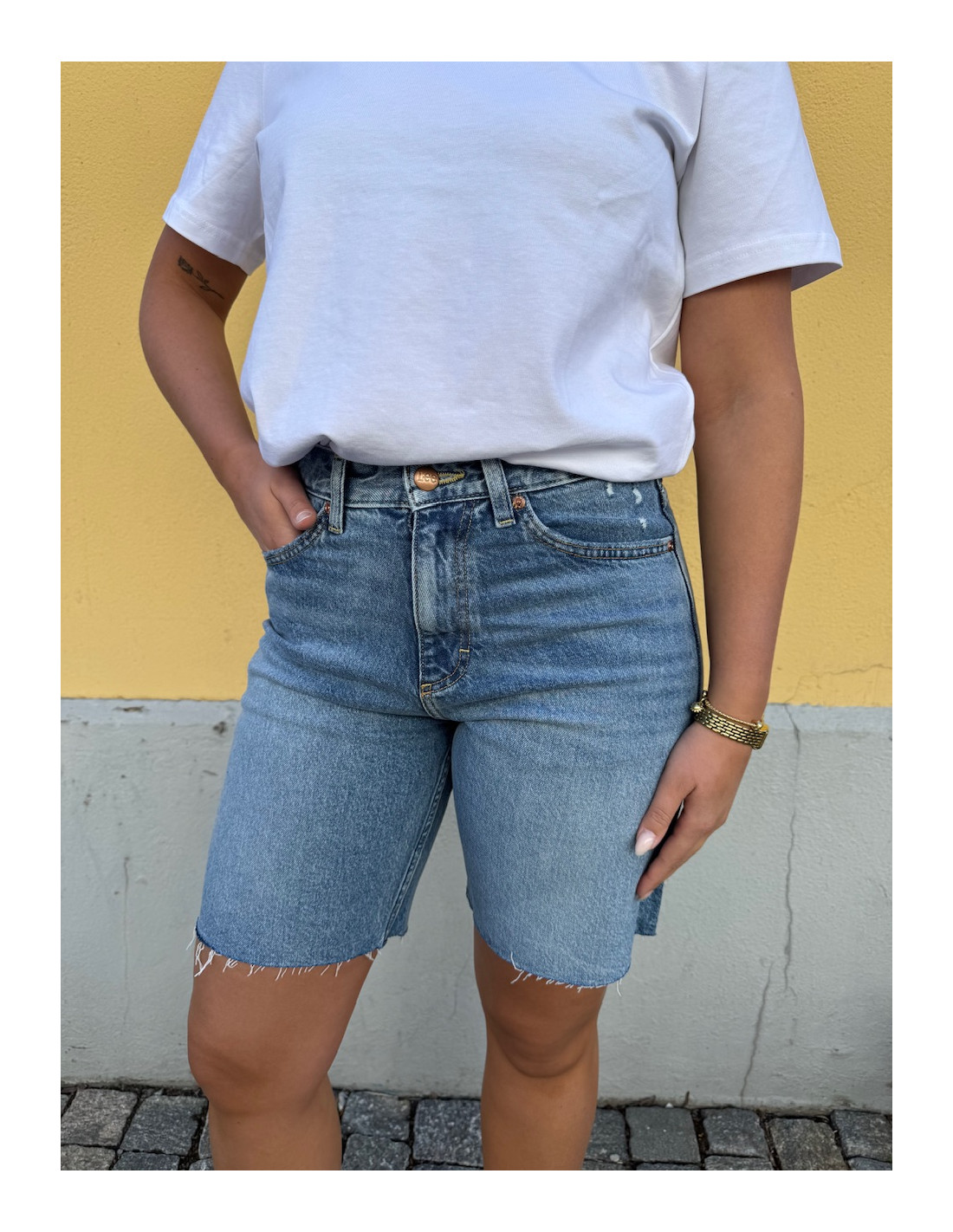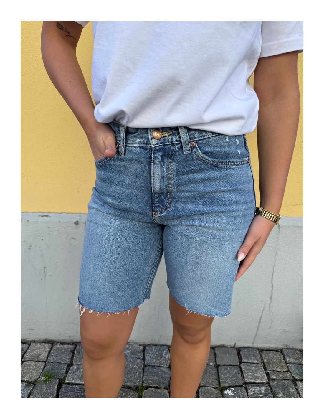 Dessa shorts är färdiga i Down The River, en gråaktig mellanblå nyans med lätt blekning över benen.