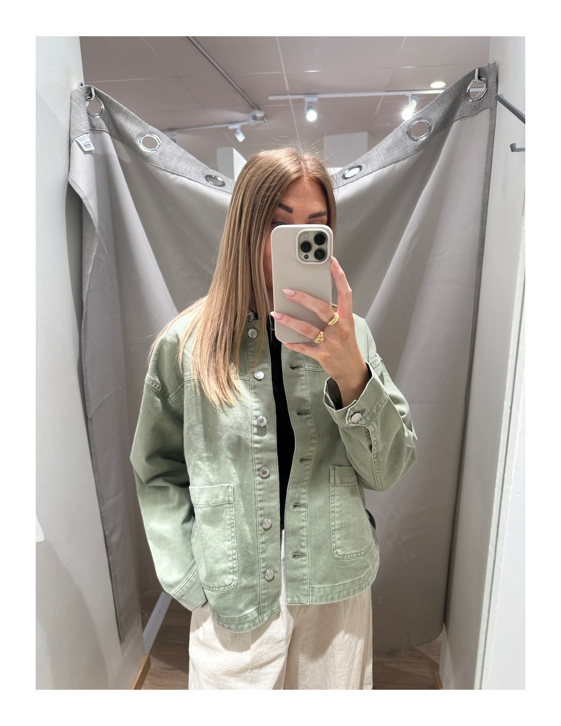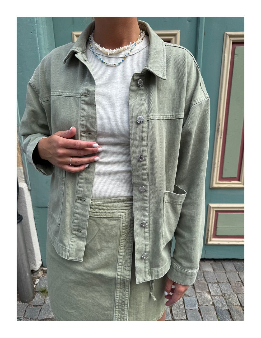Loose fit, knappar och fickor fram.