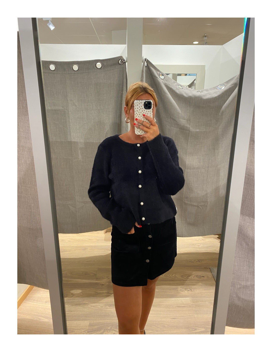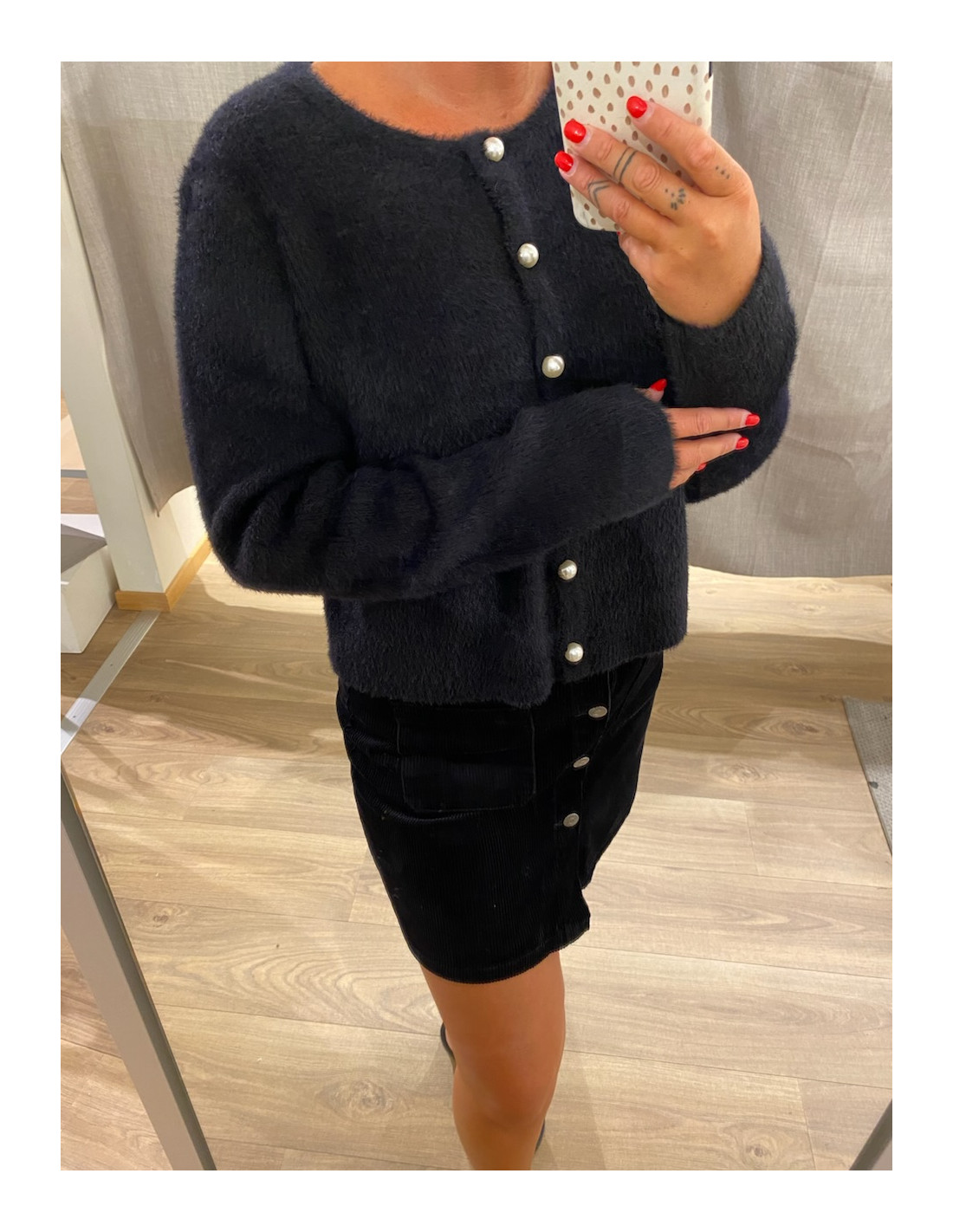 Fluffig kofta i svart och vit.