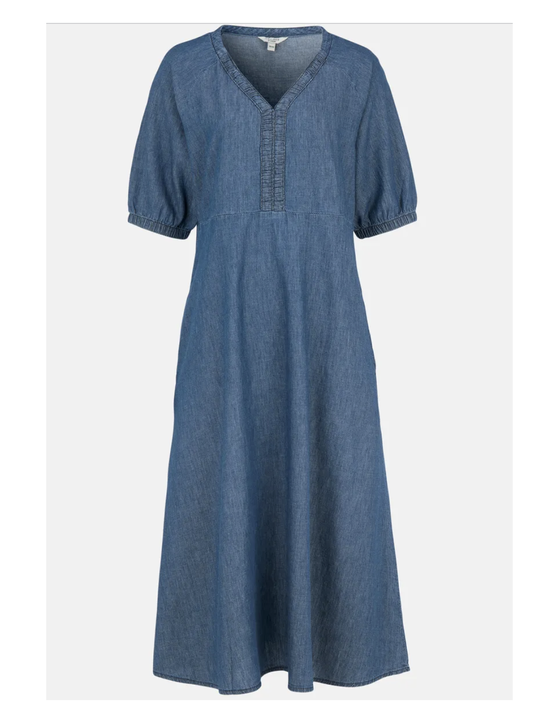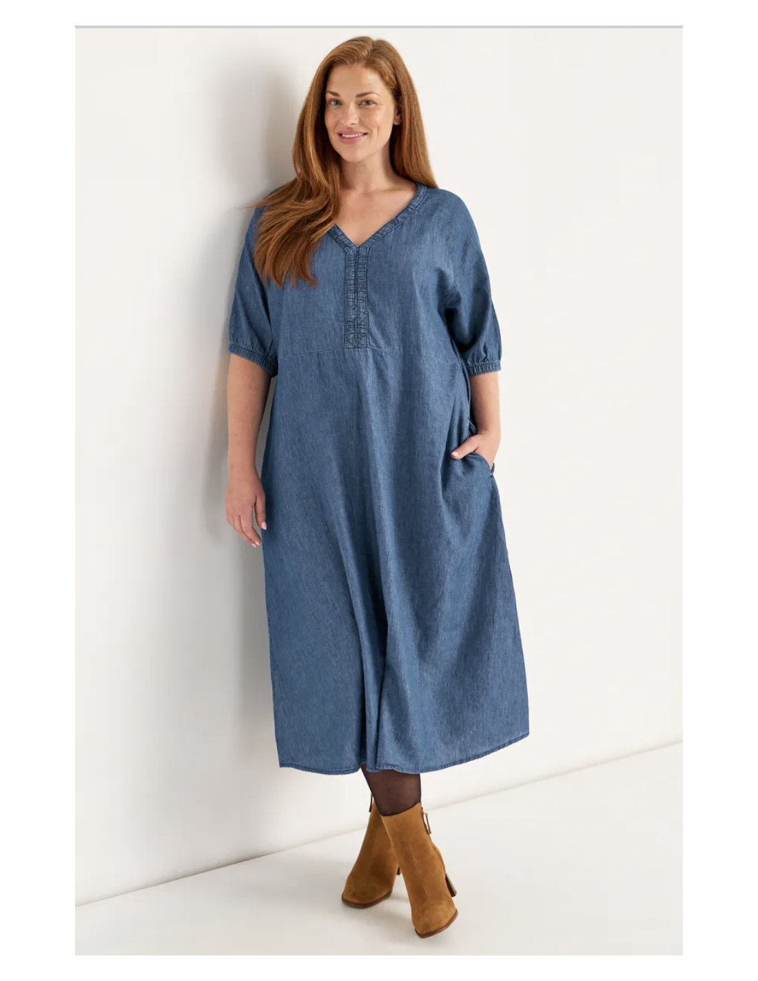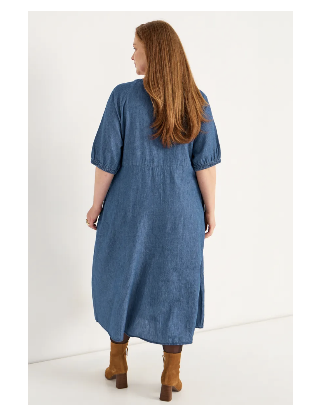 • Vävd midiklänning i denim med utsvängd passform.