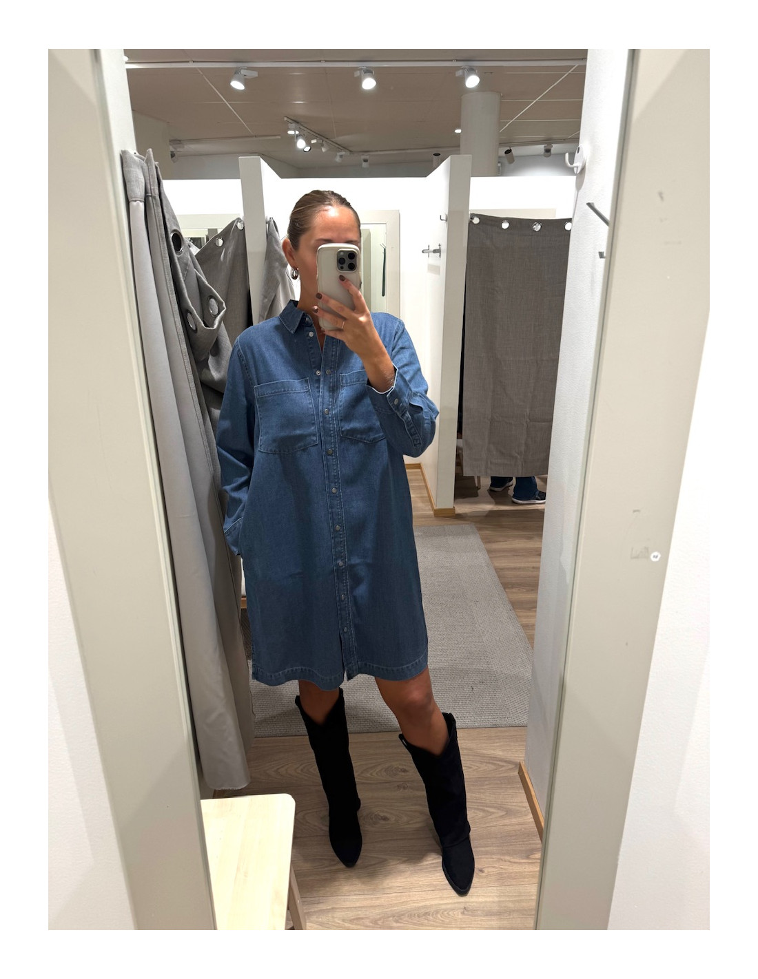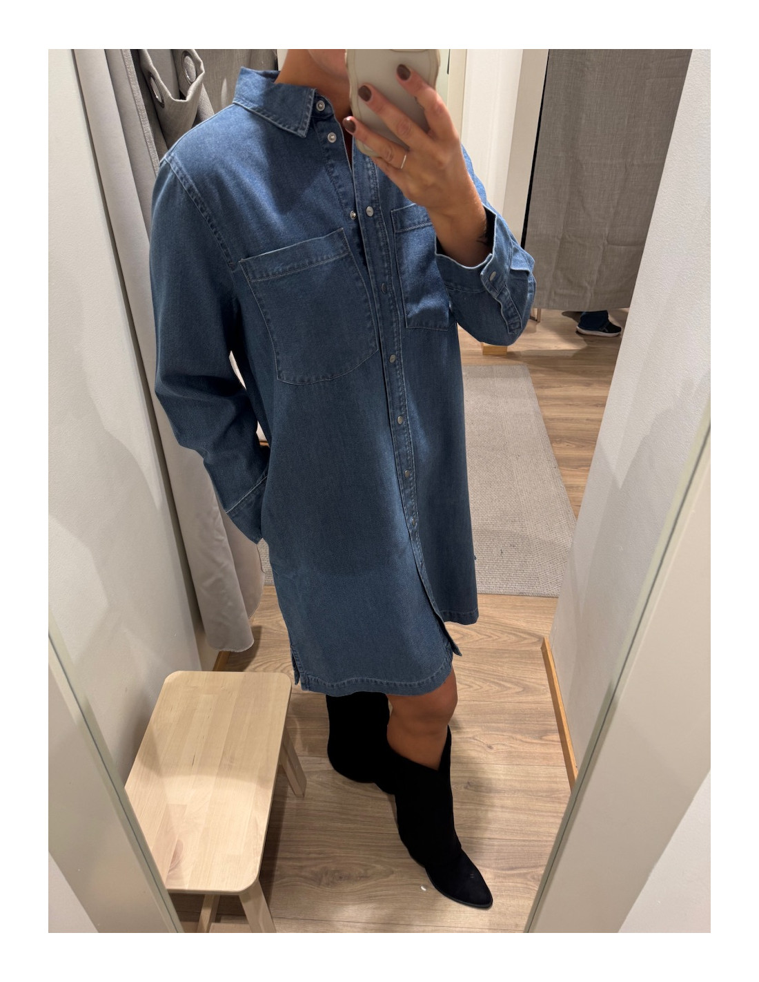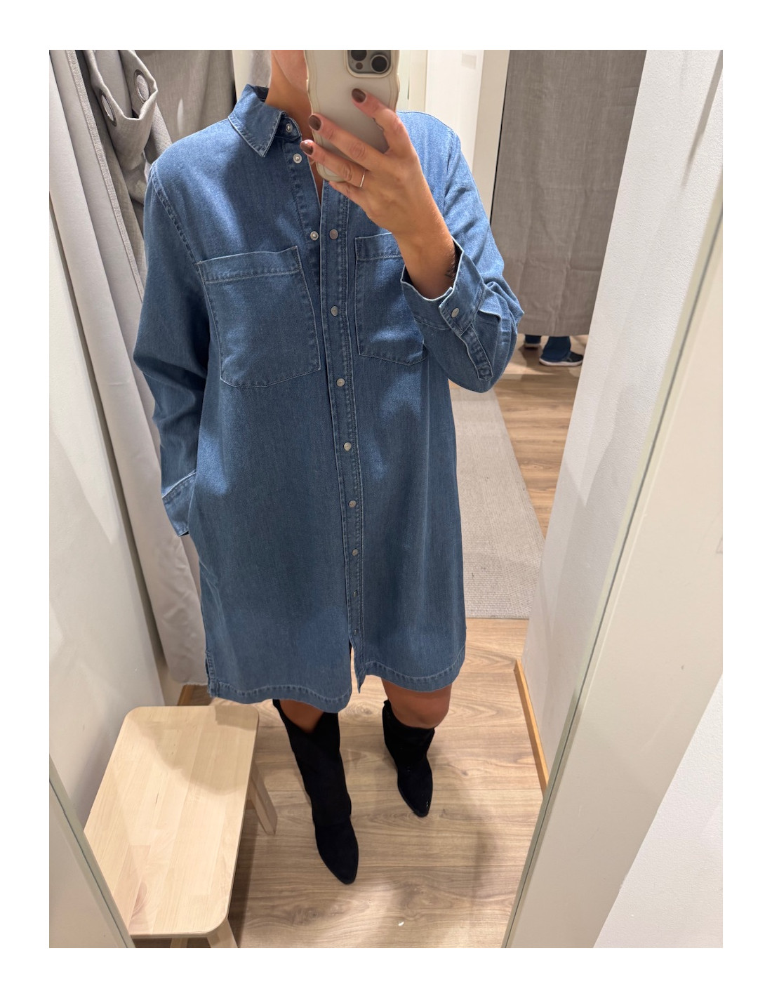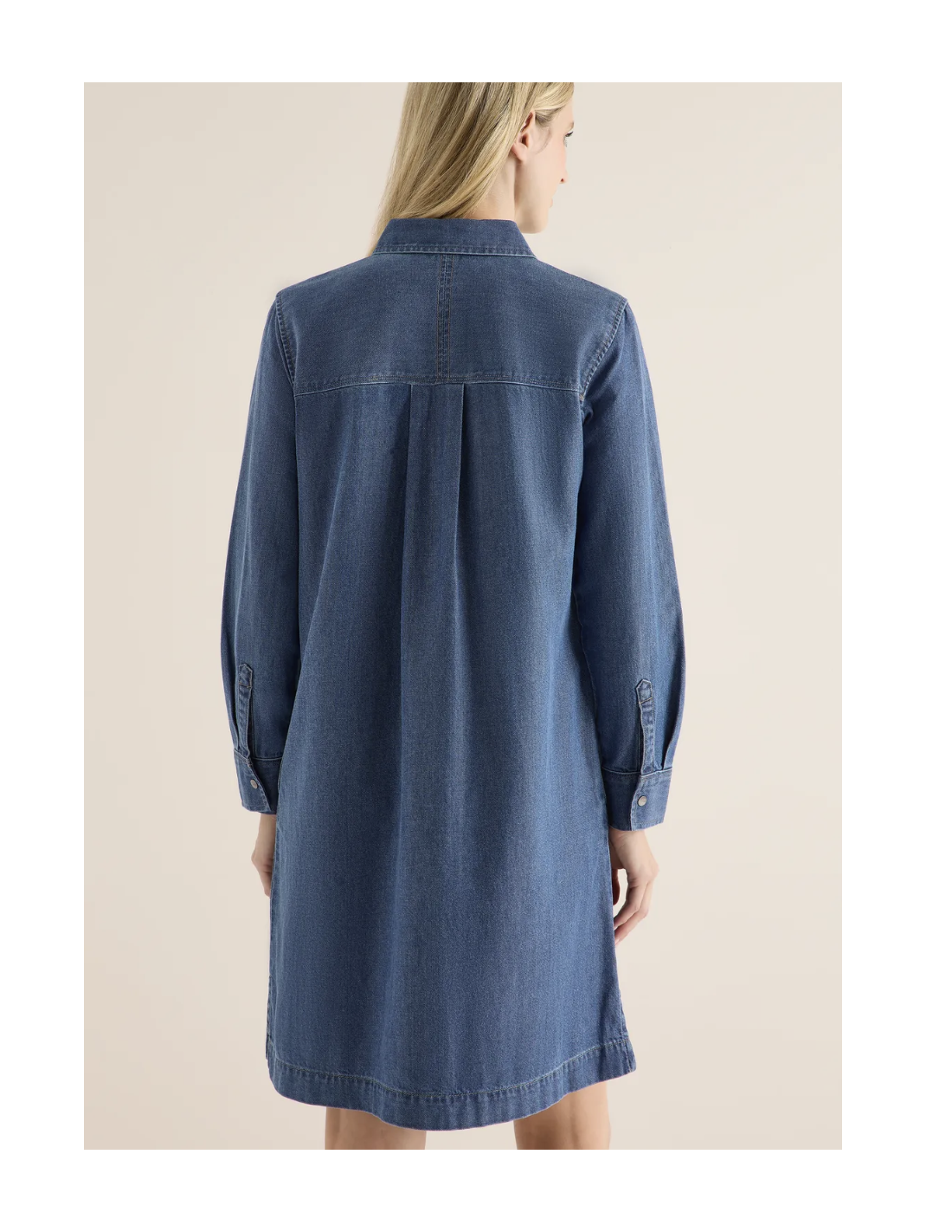 Denna knälånga klänning från CECIL för kvinnor ger din vardag en avslappnad charm med sin denimlook. Den bekväma blandningen av lyocell och bomull ger en mjuk känsla, medan skjortkragen, bröstfickorna och den hellånga knappslåen skapar en klassisk look. Perfekt för enkel kombination – oavsett om det är med sneakers eller stövlar.