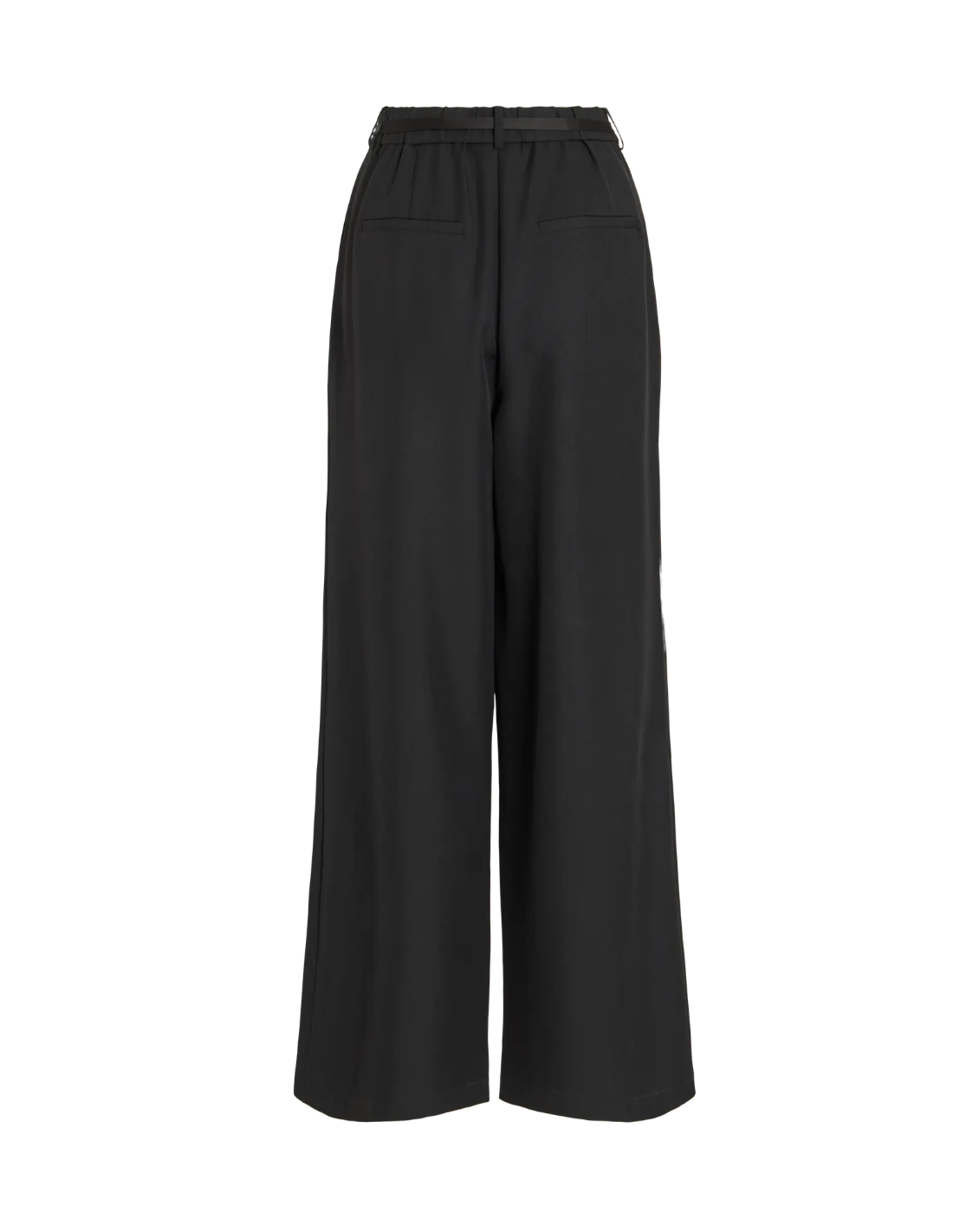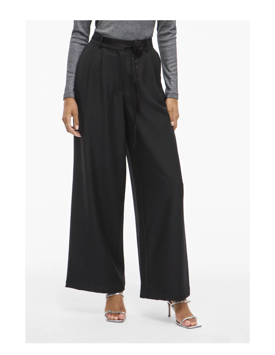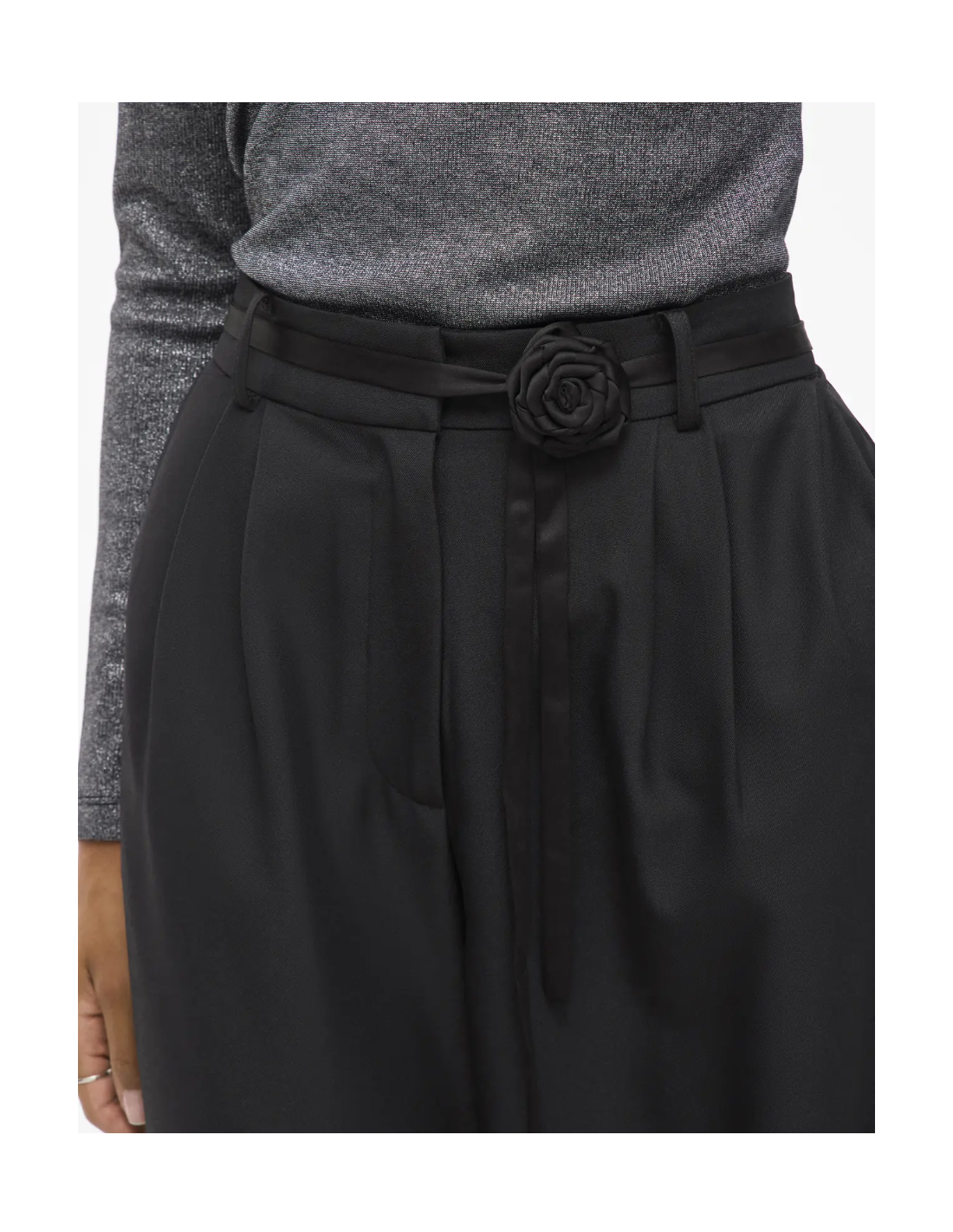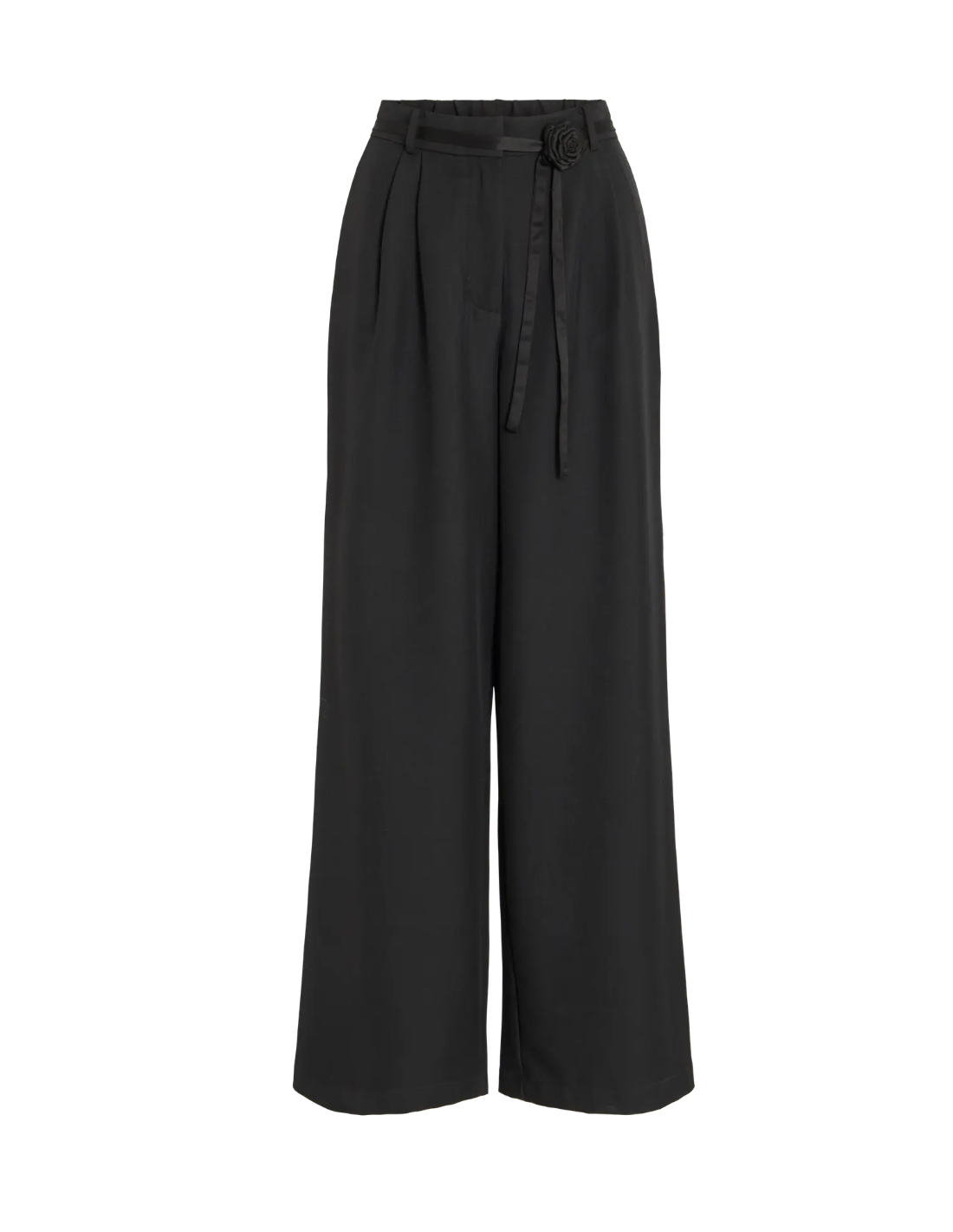 Svart kostymbyxa med hög midja. Försluts med knapp och dragkedja. Avtagbart smalt band i midjan med en ros på. Fickor. Vida.