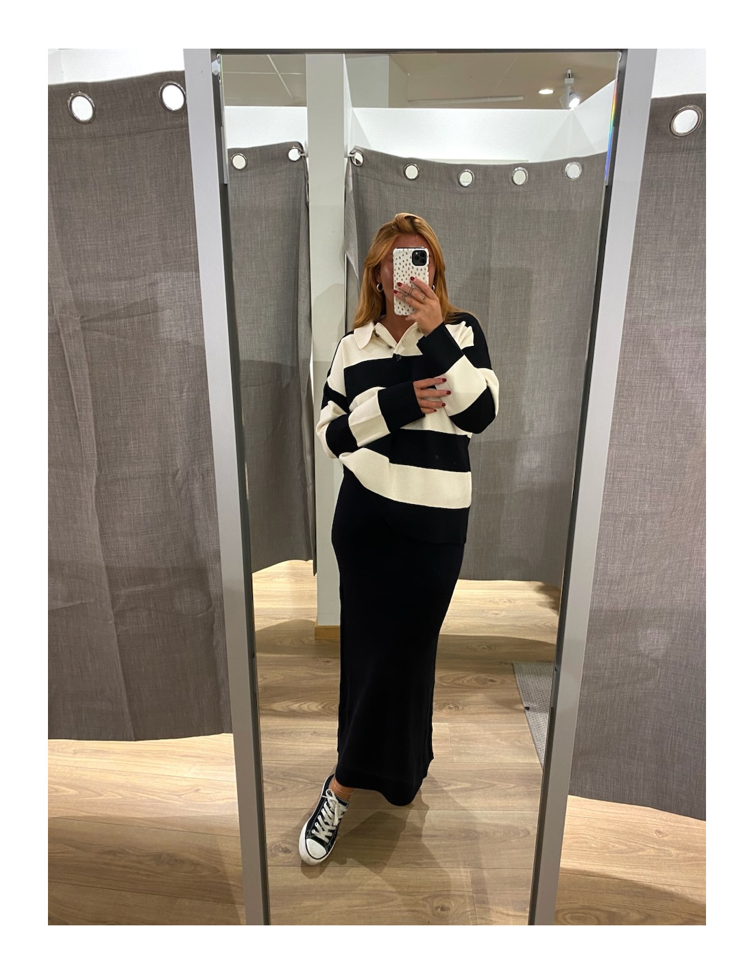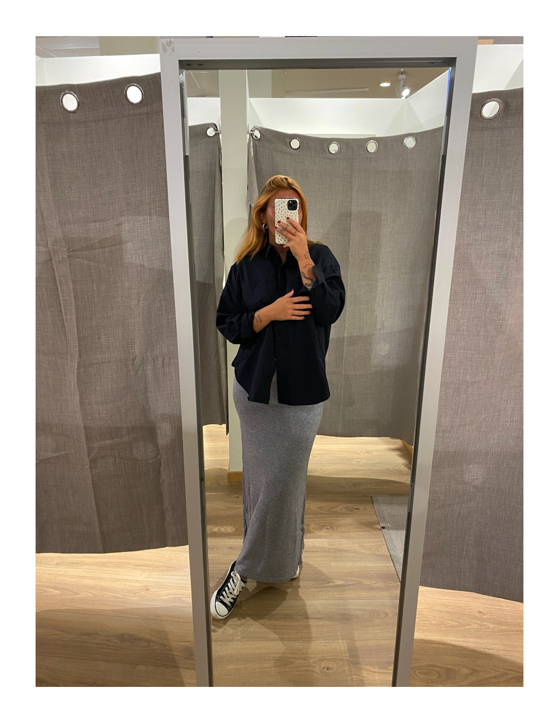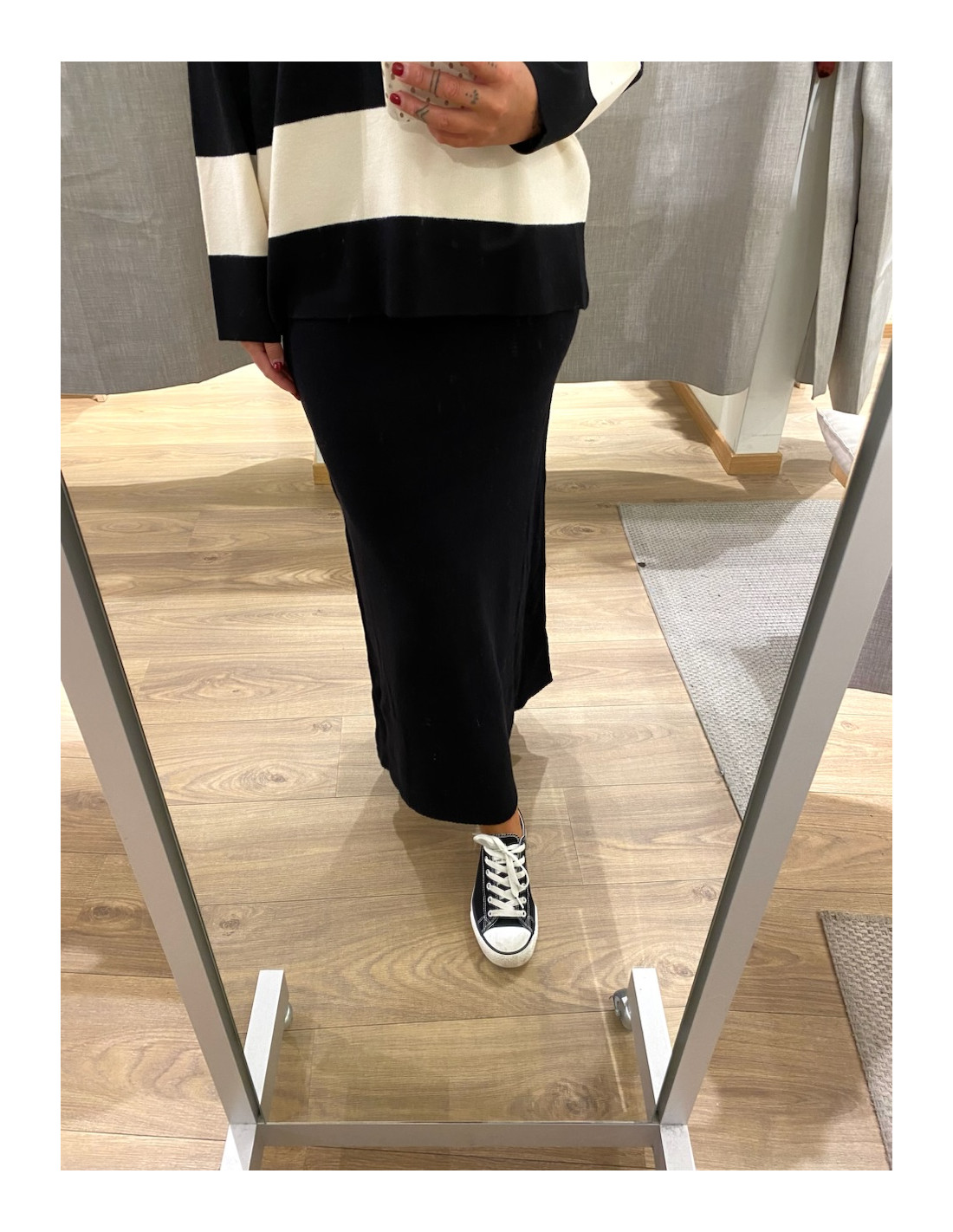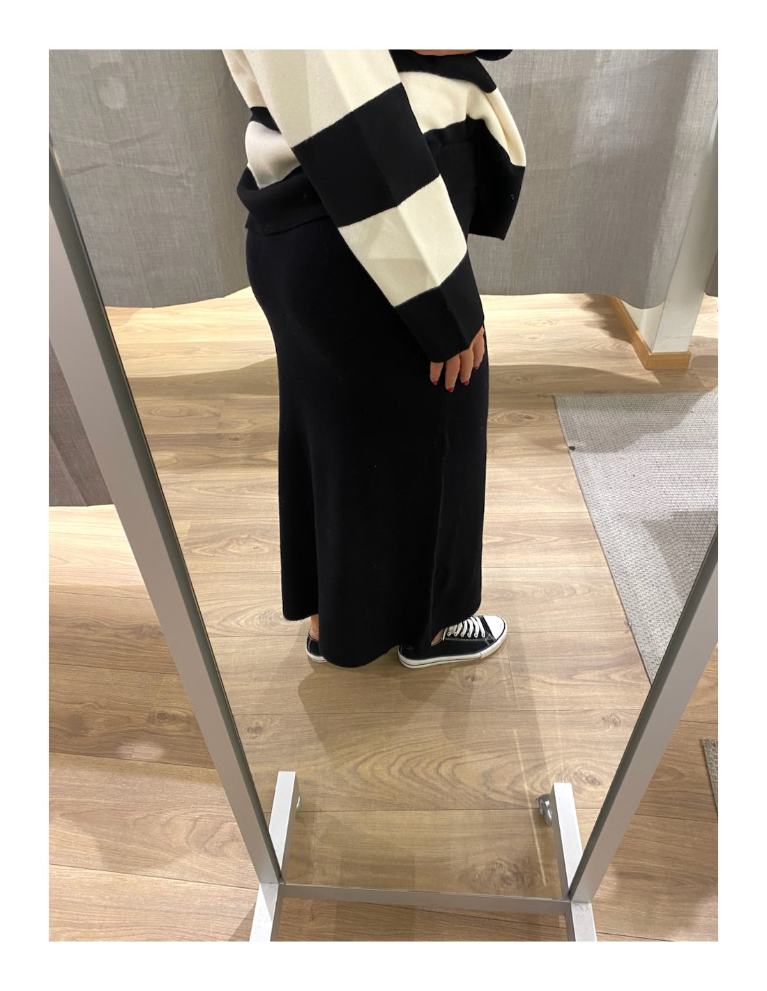 Stickad kjol i grått och svart.
