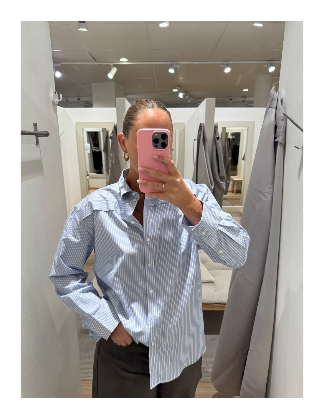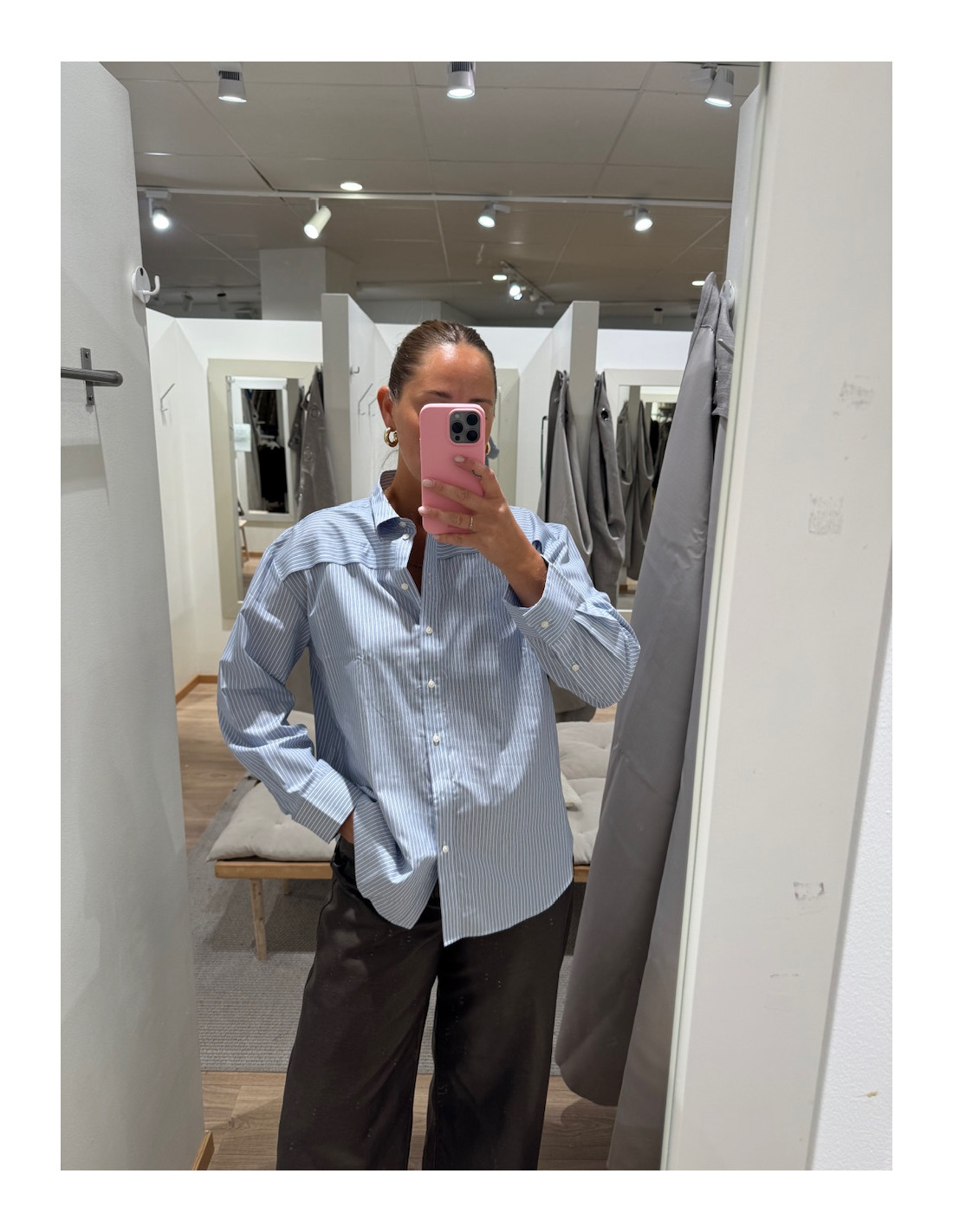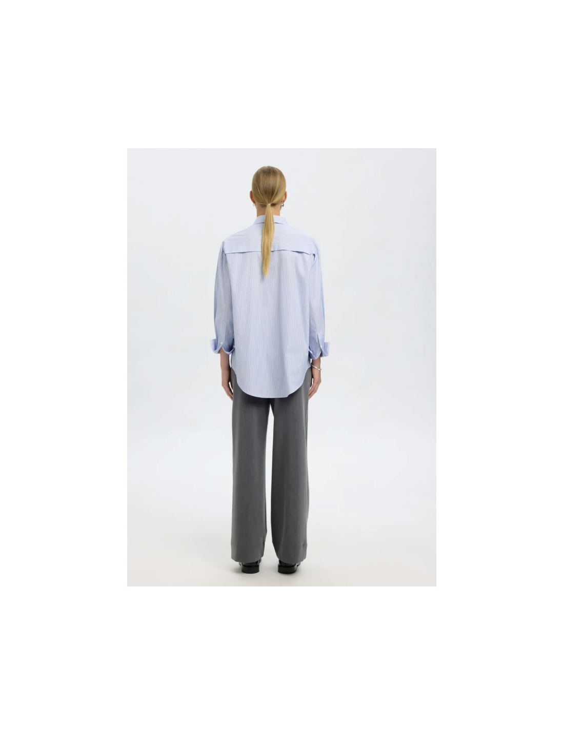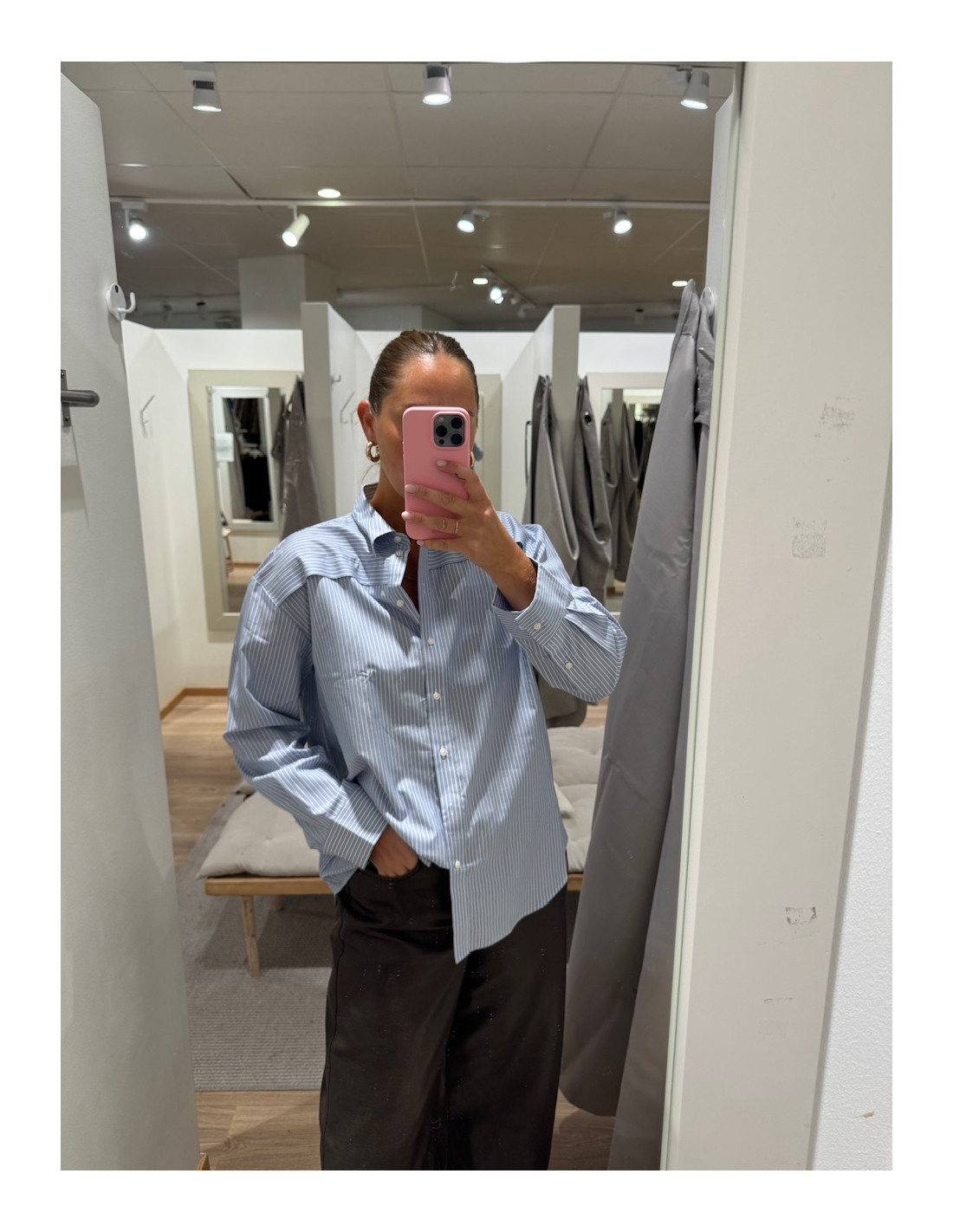 Denna långärmade skjorta är designad med en avslappnad, oversized passform och har en klassisk skjortkrage och manschetter med knappar, vilket ger en blandning av komfort och stil. Knäppningen ger en tidlös touch till detta mångsidiga plagg.