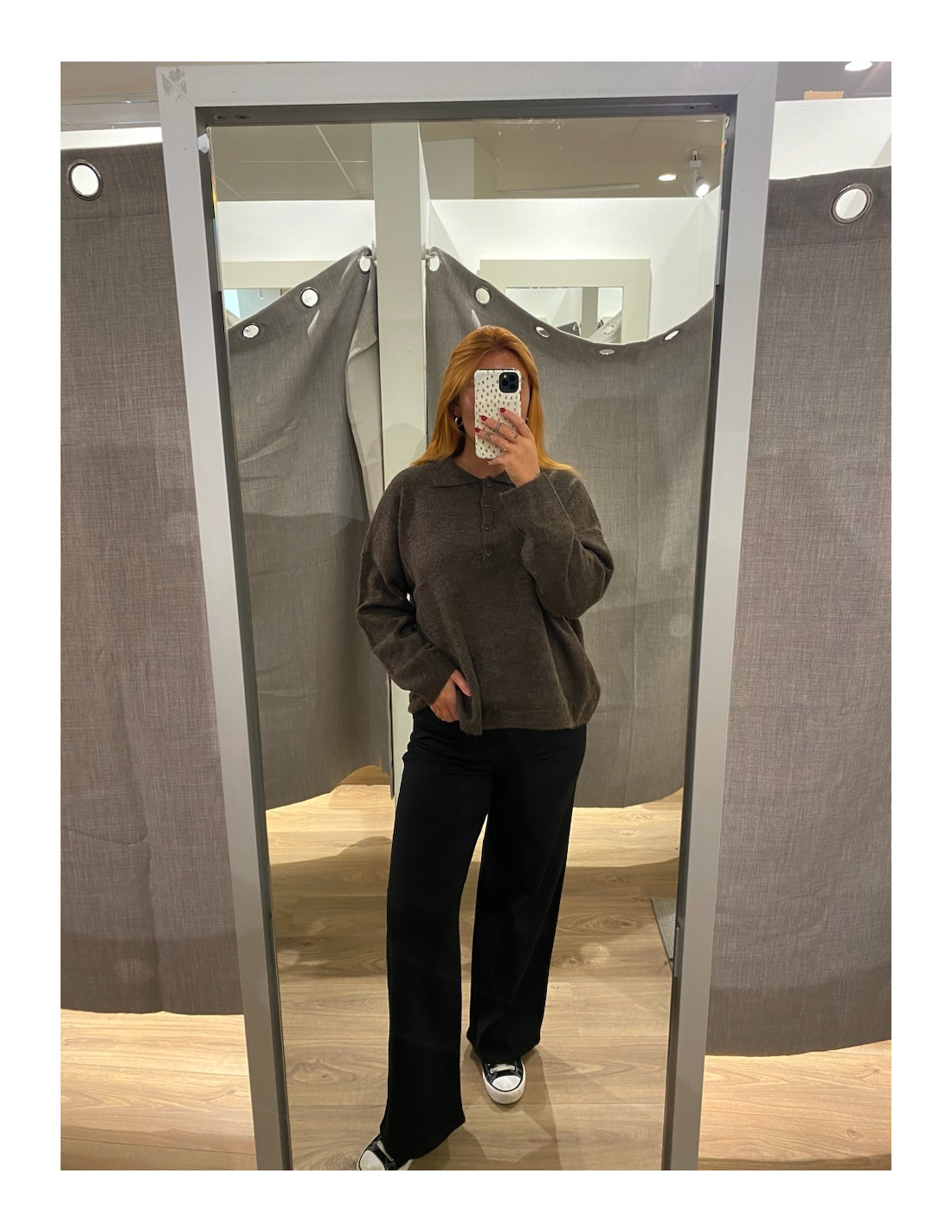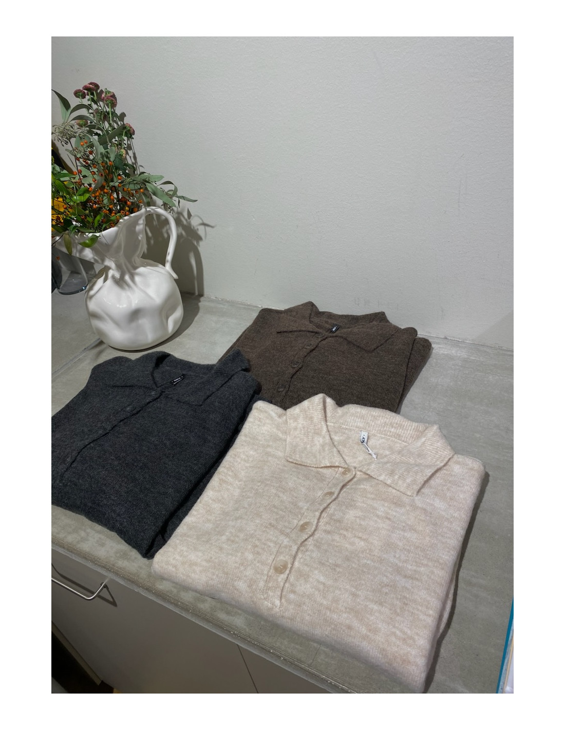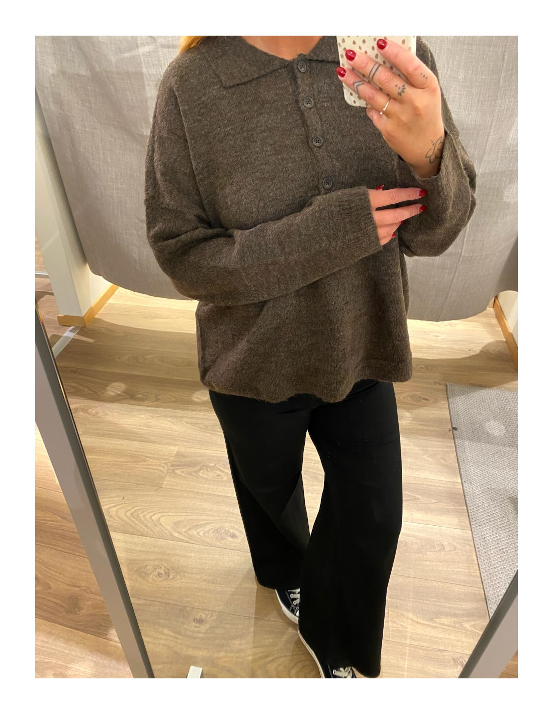 Gosig stickad tröja med knappar upptill och krage.