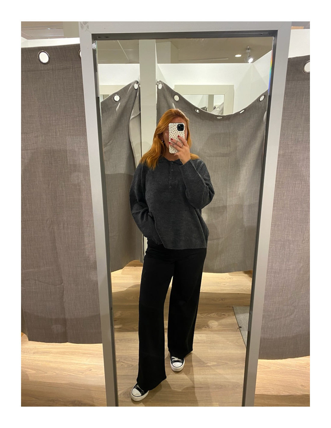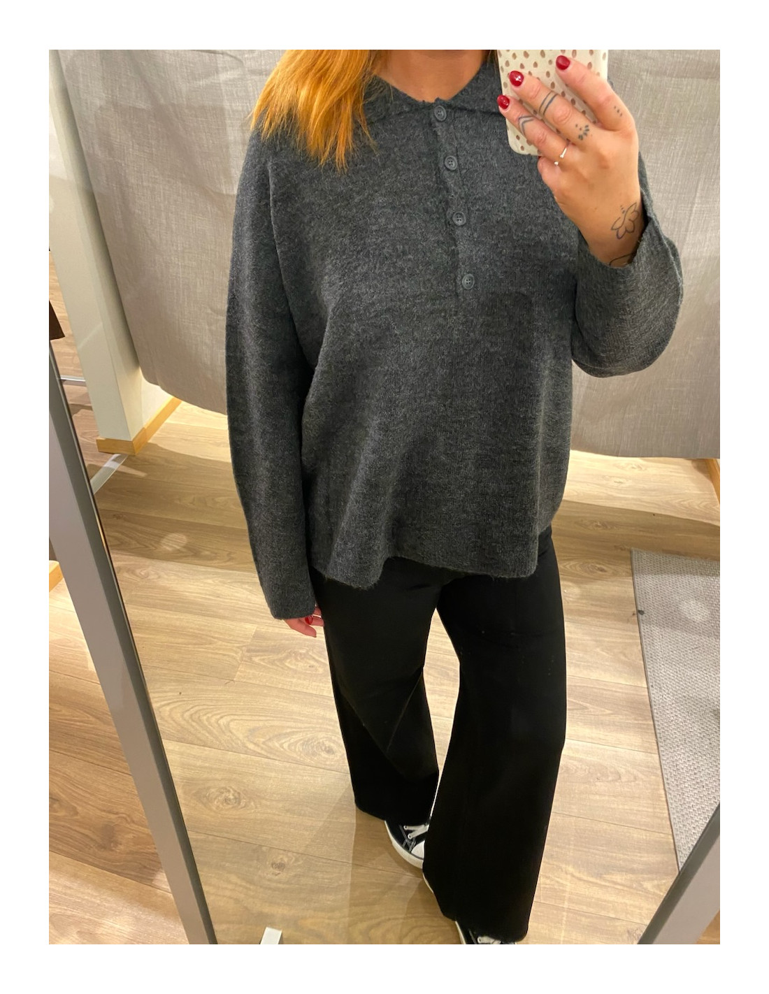 Gosig stickad tröja med knappar upptill och krage.