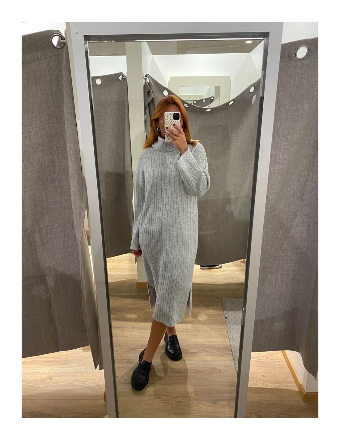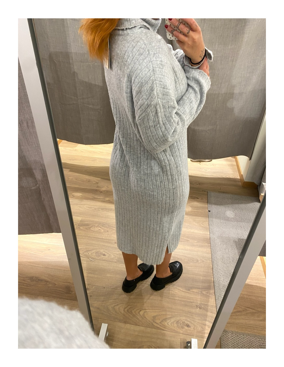 Stickad klänning i grått och svart.