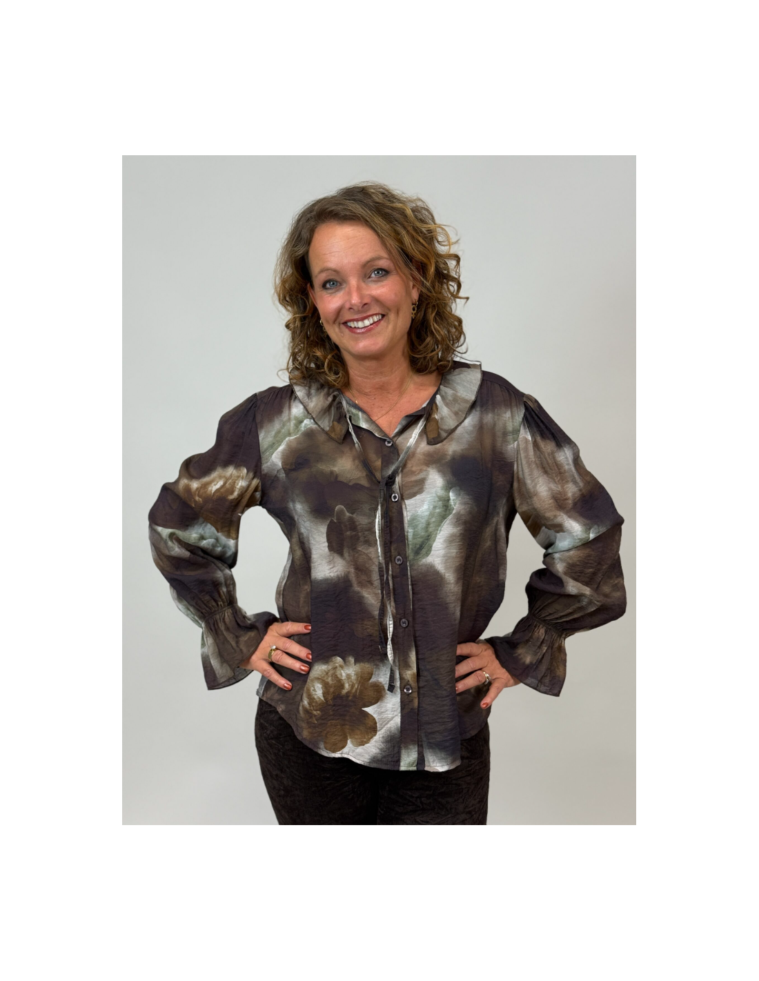 Möstrad blus från Mix By Heart med volang i ärmslut samt hals.