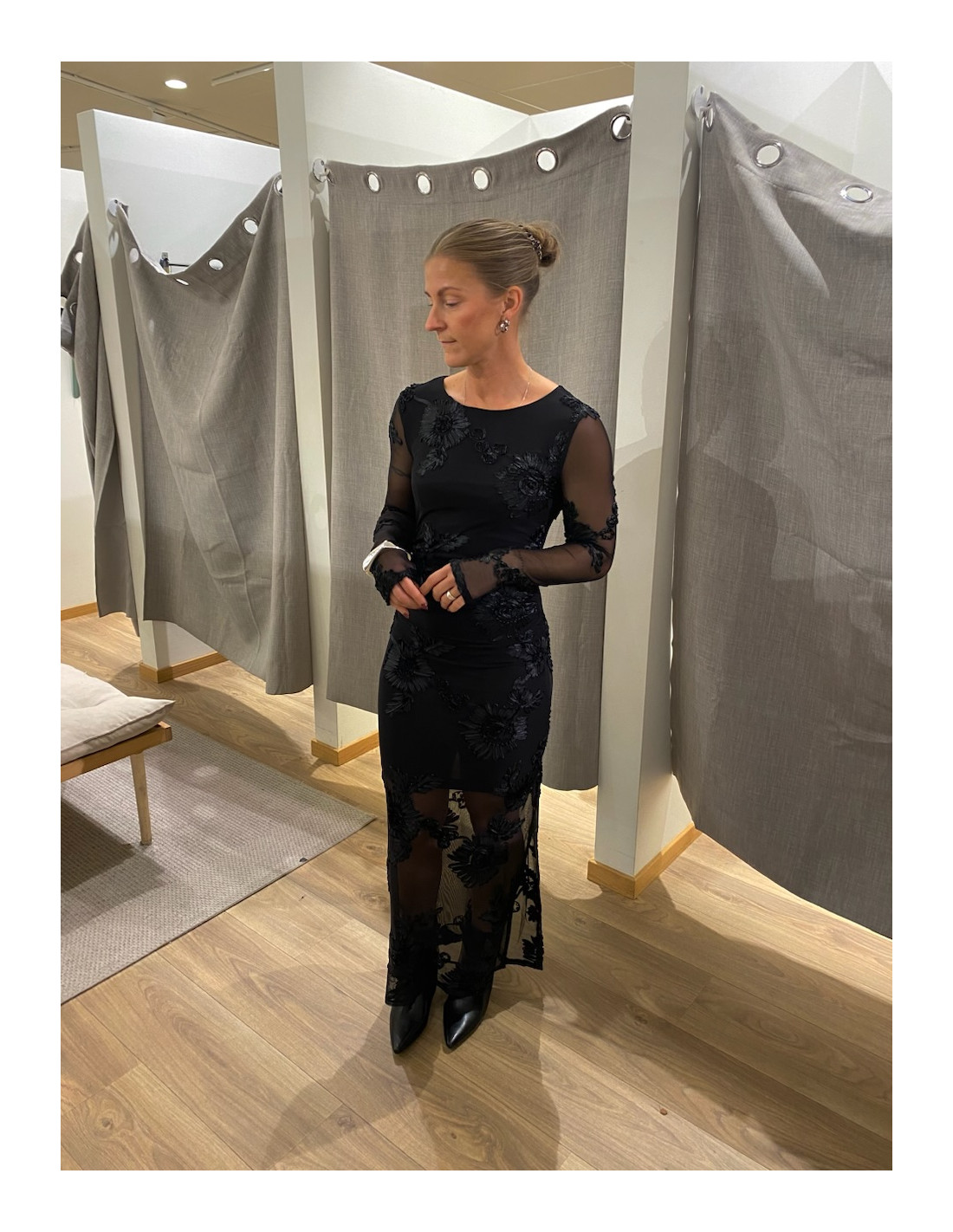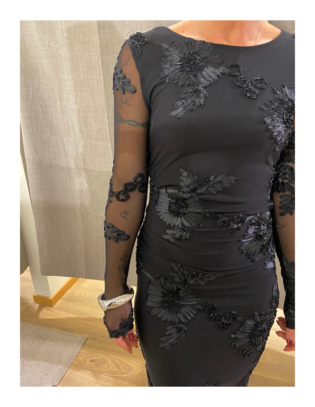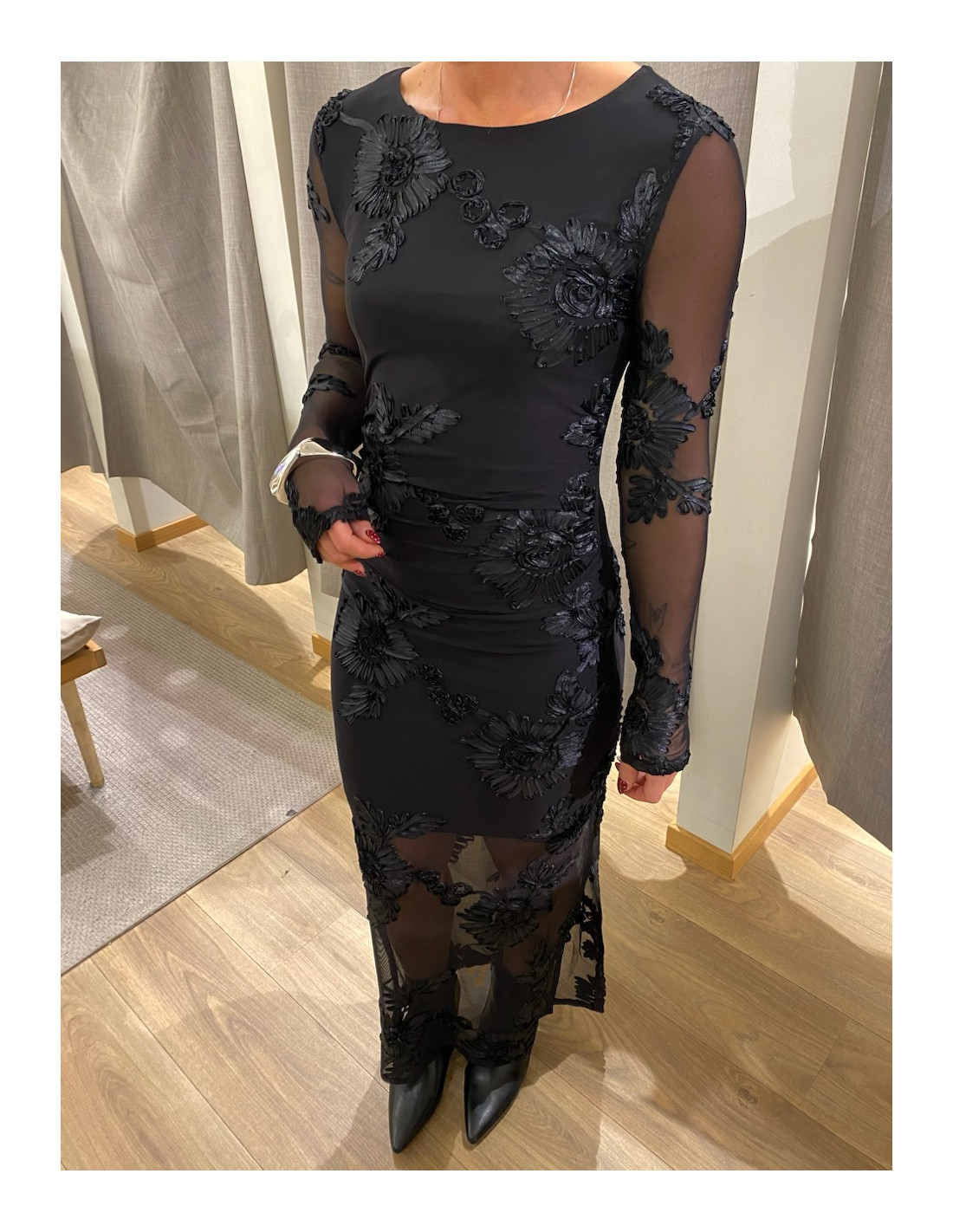 Klänning med transparanta ärmar och nederdel.
