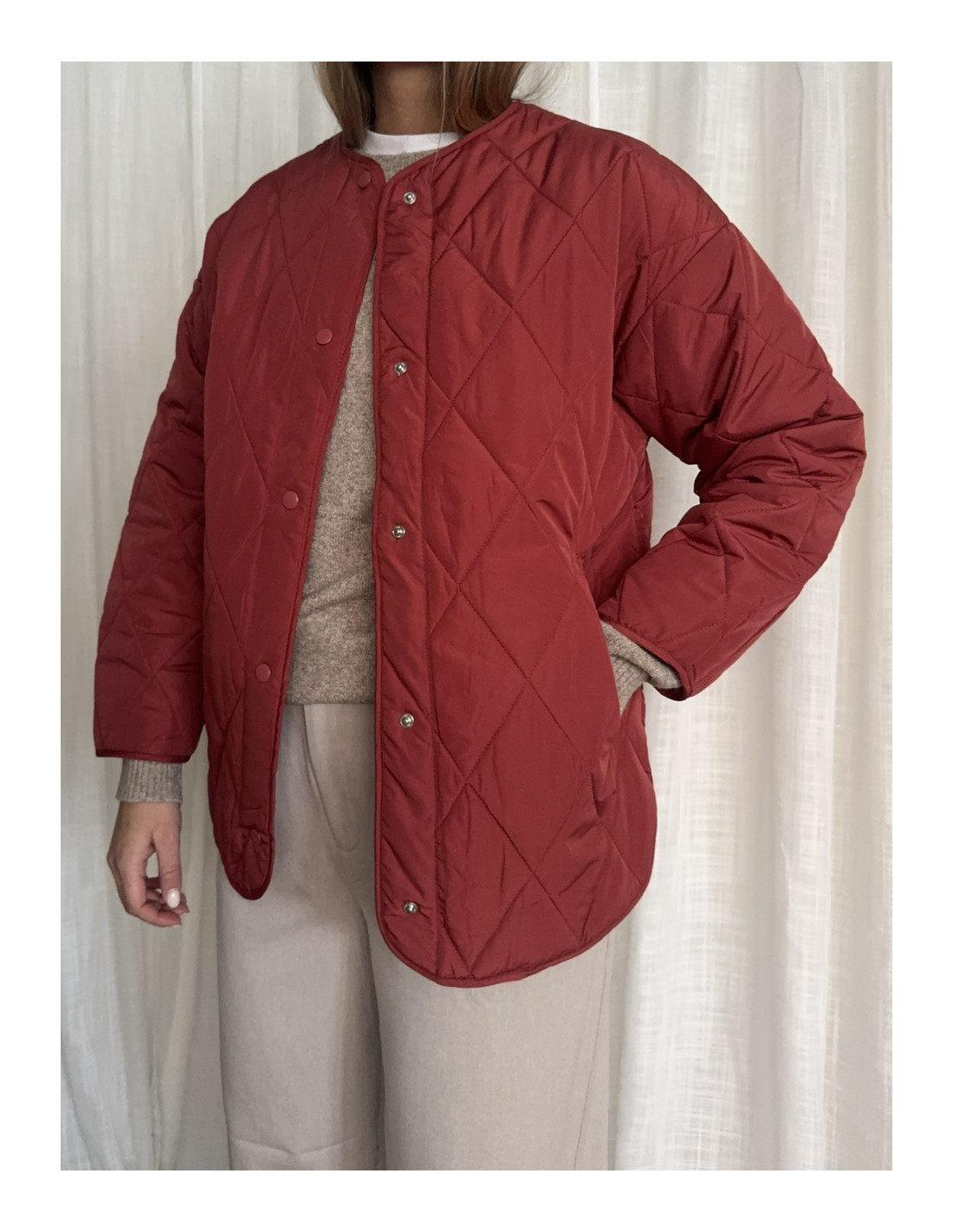 Quiltad jacka med fickor och tryckknappar.