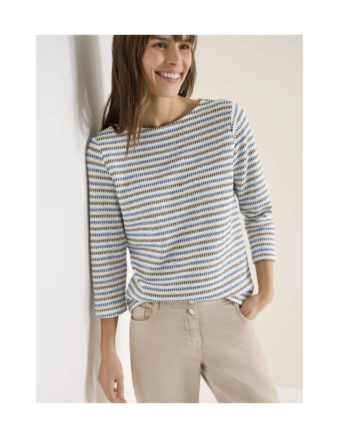 Denna damskjorta från CECIL har en modern stickad look med livfulla flerfärgade ränder – perfekt för fräscha, avslappnade stilar. Båthalsringningen och trekvartsärmarna skapar en feminin silhuett. Bekväm att bära – perfekt för din avslappnade vardag.