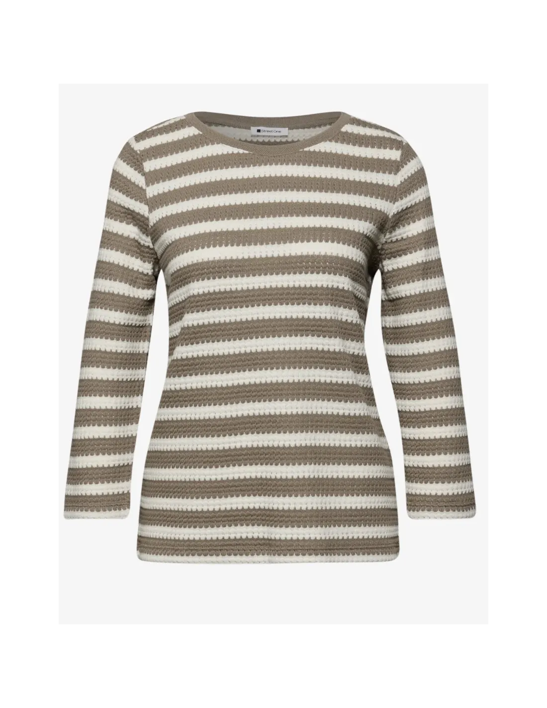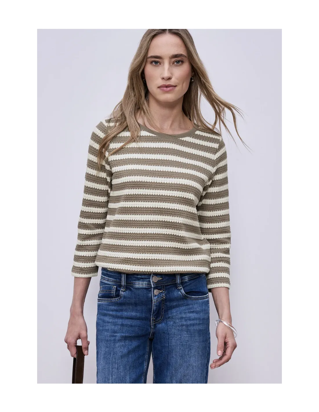 Denna randiga tröja med stickat utseende från Street One för kvinnor är perfekt för vardagsbruk och kan kombineras på många sätt. Den mjuka bomullsblandningen och trekvartsärmarna gör den bekväm, medan båthalsringningen ger en feminin touch. En skjorta som är lätt att styla – avslappnad, bekväm och modern.