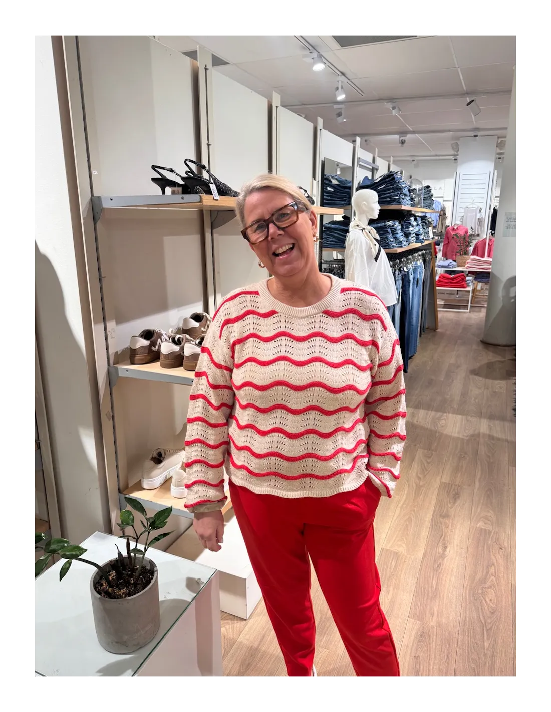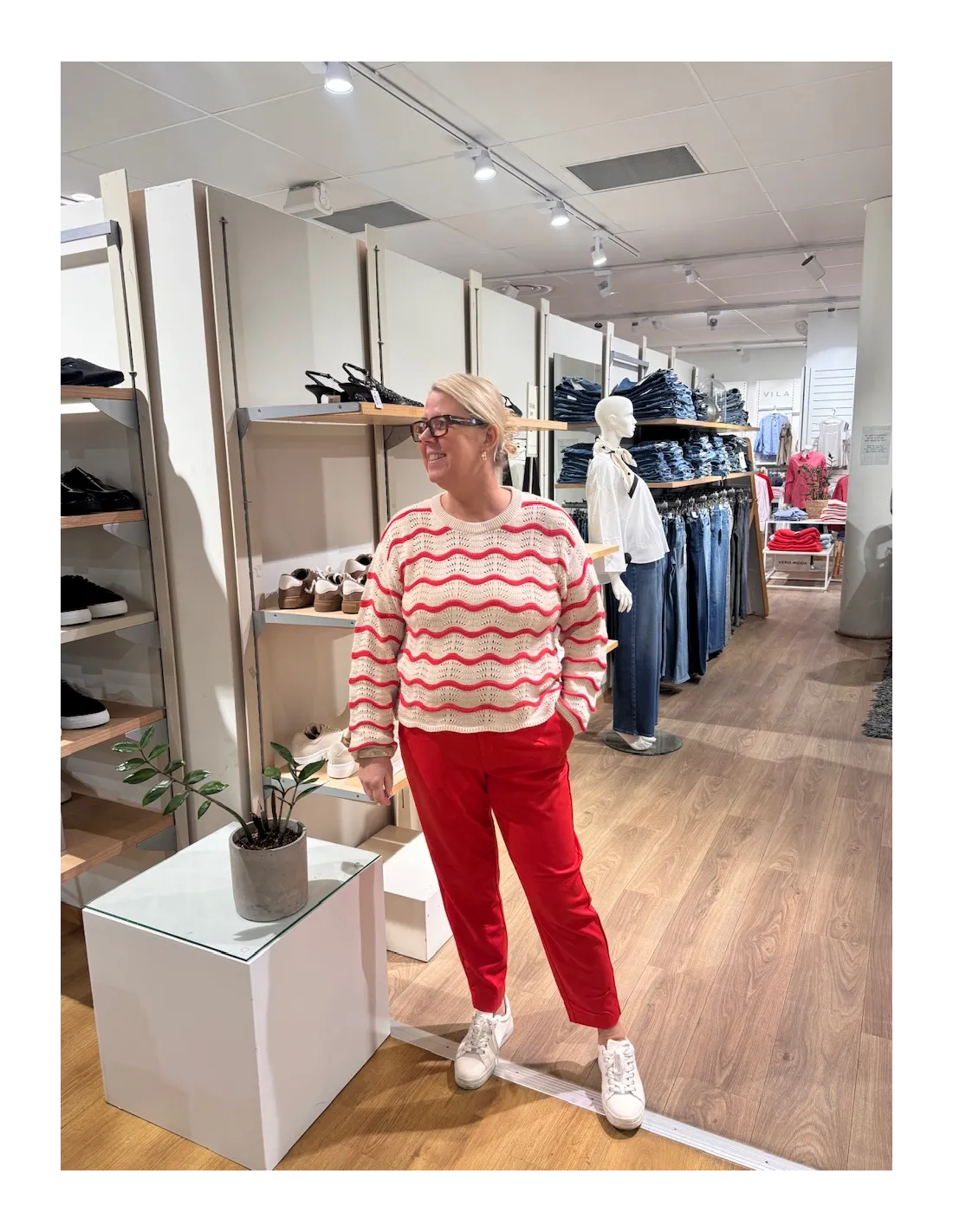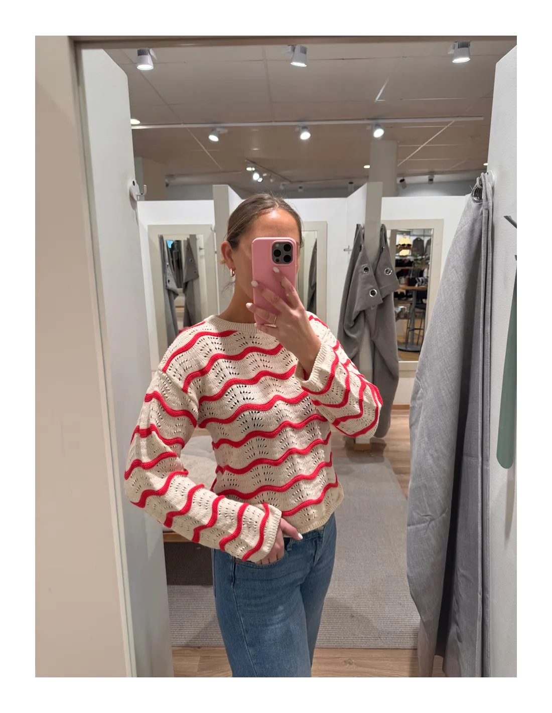 Kajsa i provrummet bär M och Hea med röda byxorna bär L.