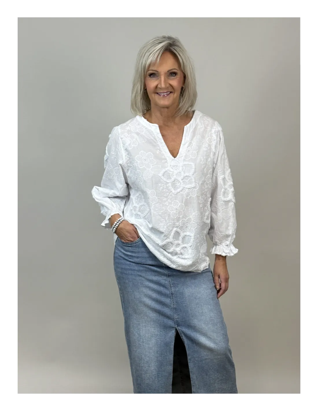 Blus med blomapplikationer och med 3/4 dels ärm.