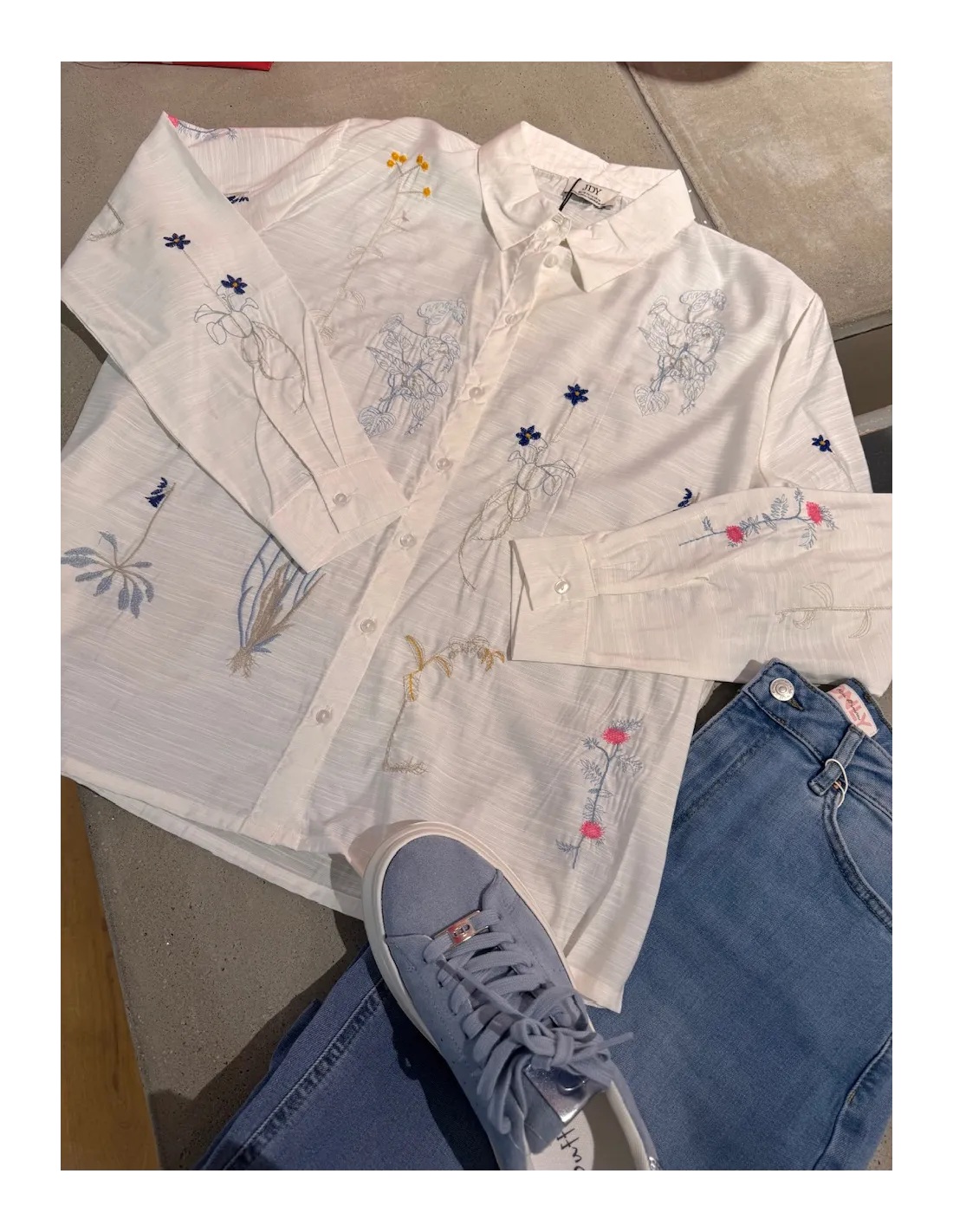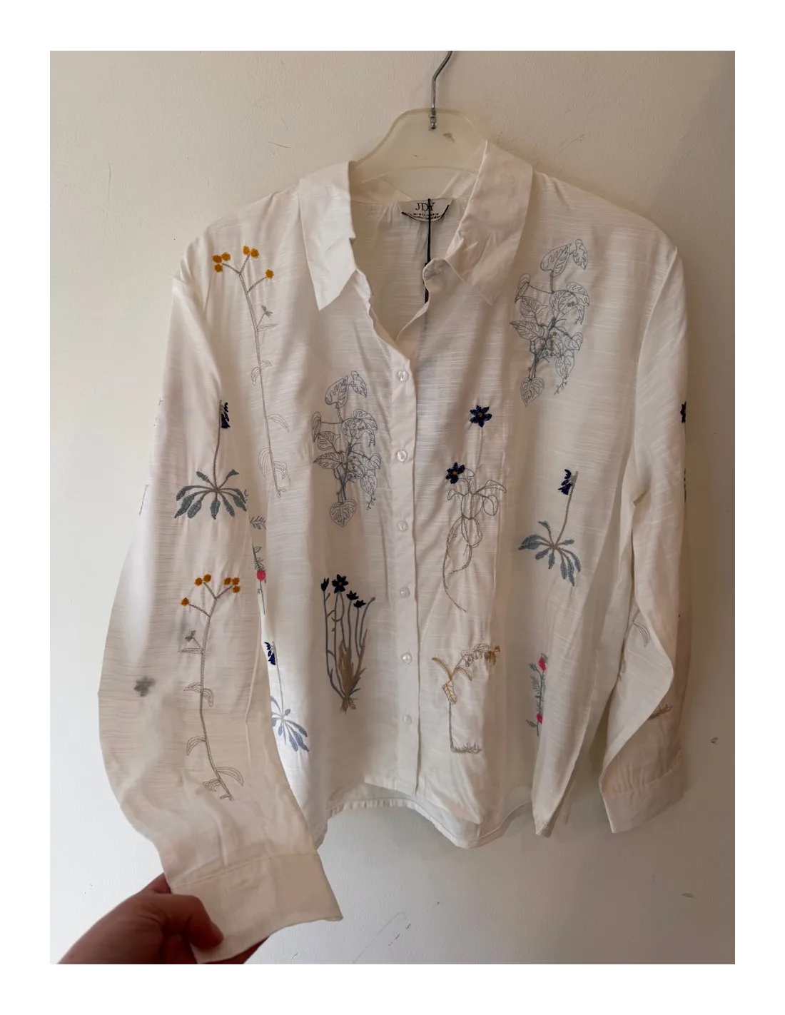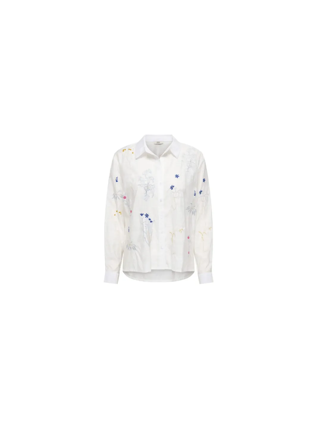 Vit skjorta från JDY med färgglad blomsterbroderi. Skjortan har en lös passform och långa ärmar med klassisk skjortkrage och knapplåsning fram.