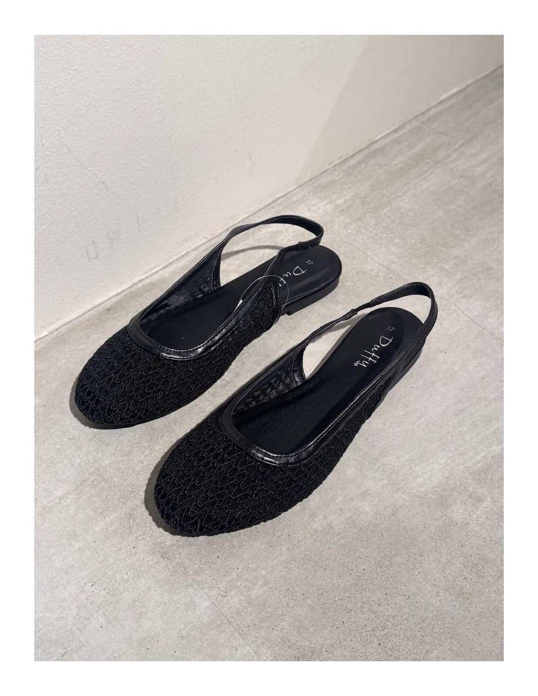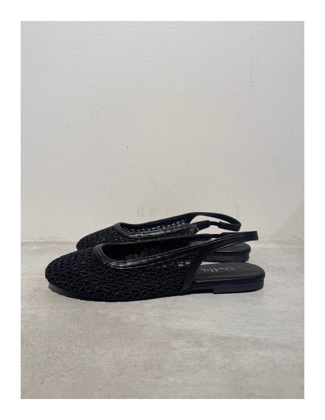 Luftiga ballerinaskor i flätat material, snygga både till vardag och fest. Elastisk rem vid hälen.