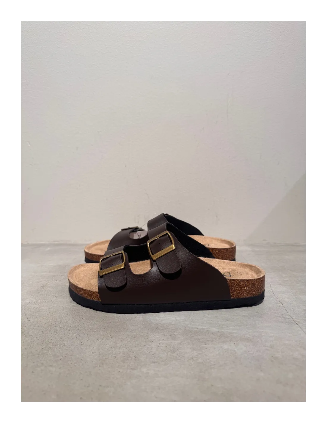 Stilren slip-in sandal med två remmar som står för tidlös design. Remmarna över foten har justerbara spännen, vilket gör att den passar både smalare och bredare fötter.
